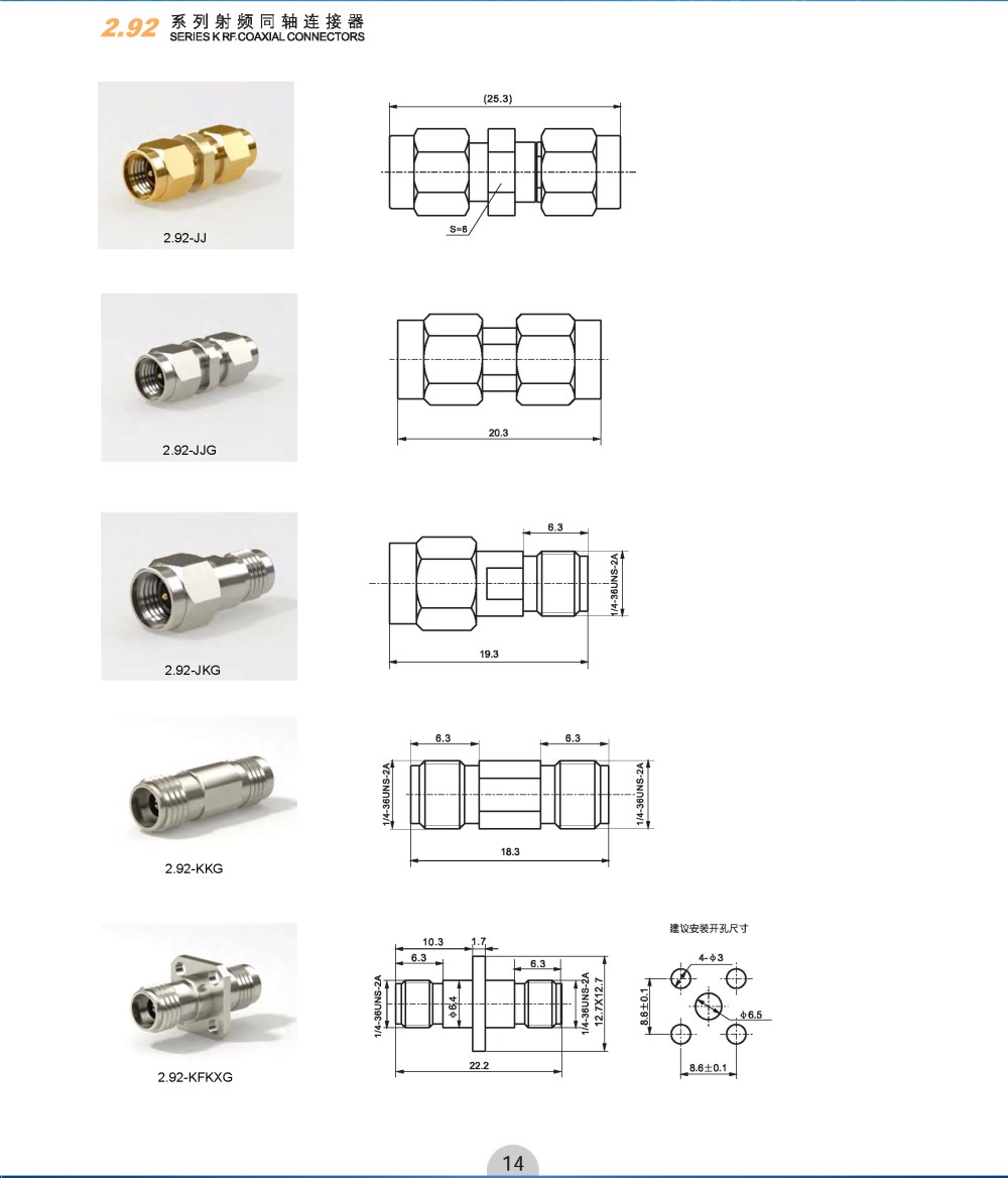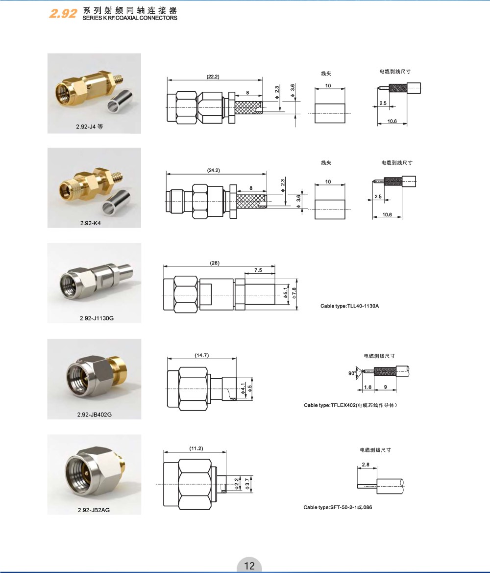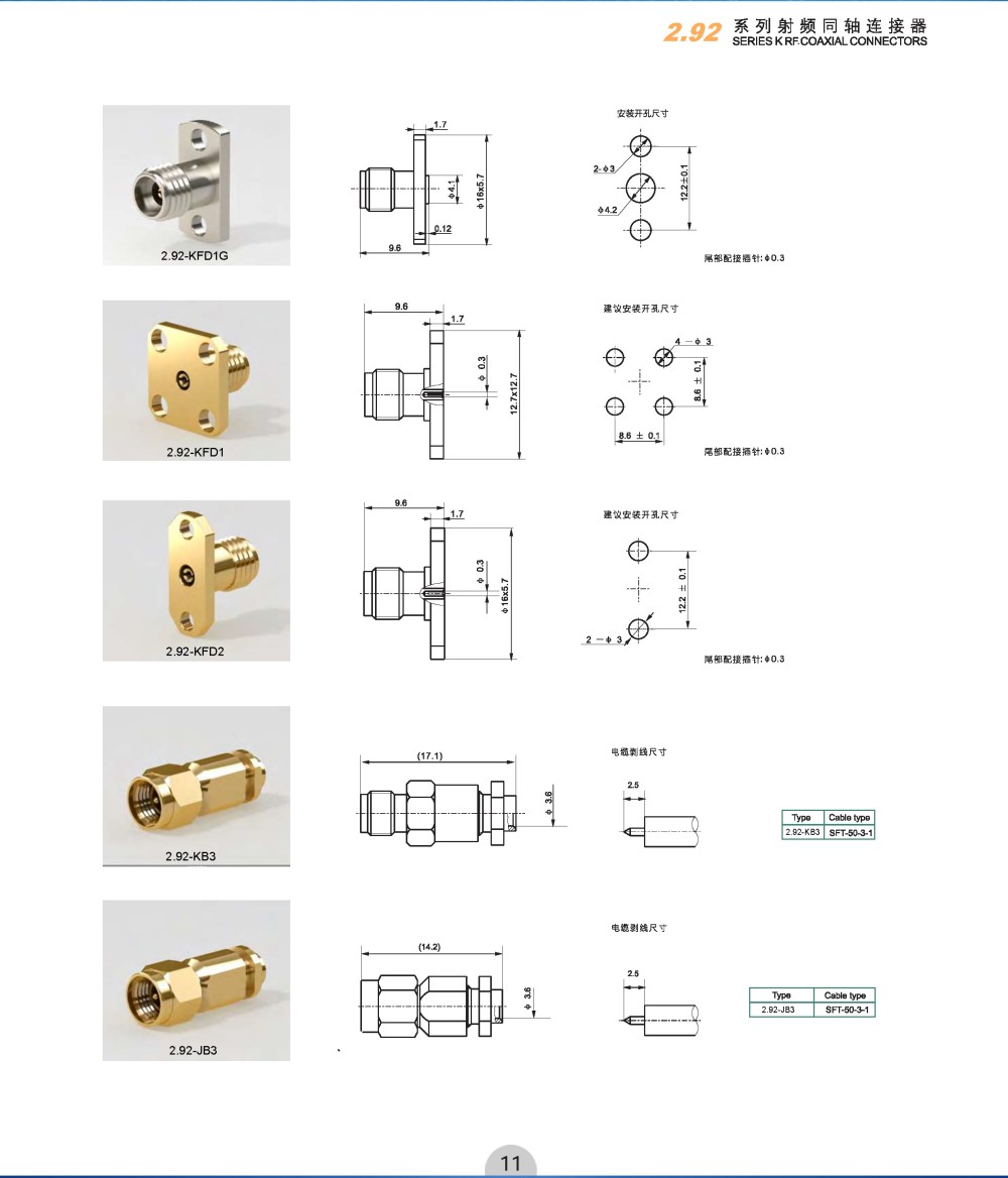 2.92系列产品是在SMA基础上发展起来的精密毫米波连接器,可与SMA系列产品对接互换,采用空气界面,具有体积小,重量轻,使用频率高,连接可靠等优点,广泛应用于现代精密计测领域和各类毫米波通信设备中。