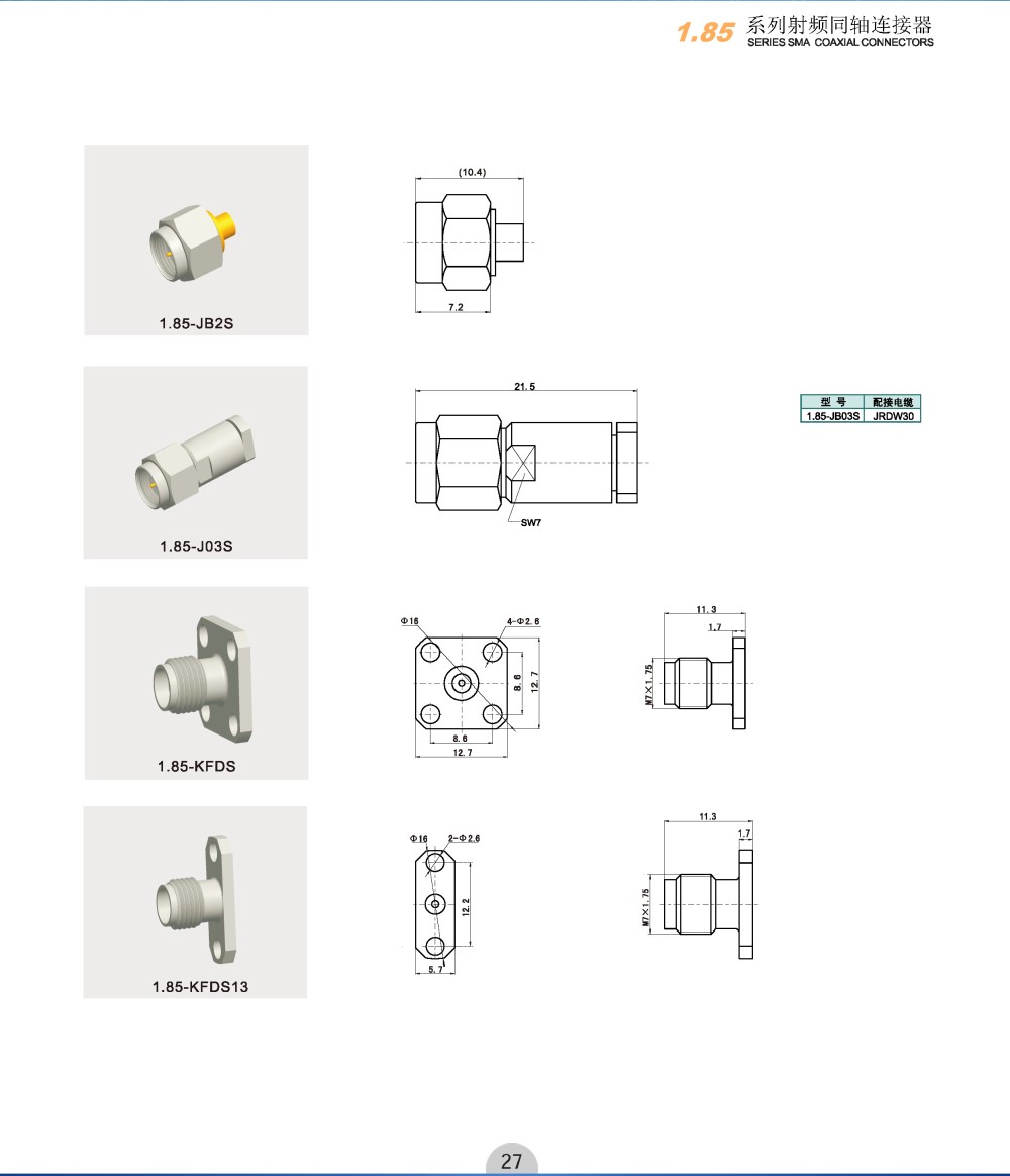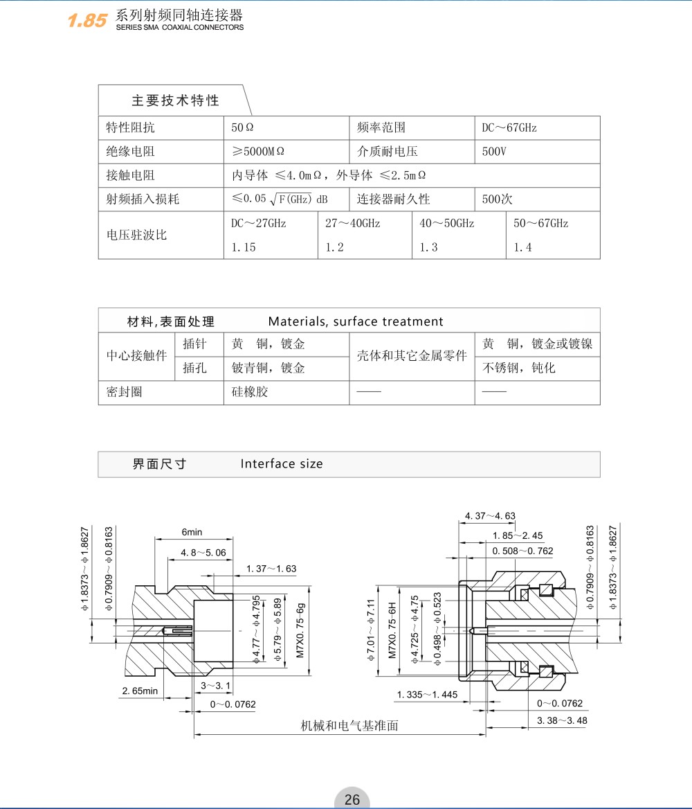 产品描述:1.85系列毫米波同轴连接器采用空气界面,使用频率高达67GHz,可与2.4系列产品对接互换。具有体积小、重量轻、使用频率高、连接可靠等优点,广泛应用于现代精密测量领域和各类毫米波通信设备中。