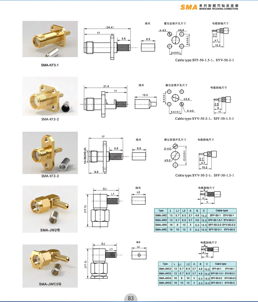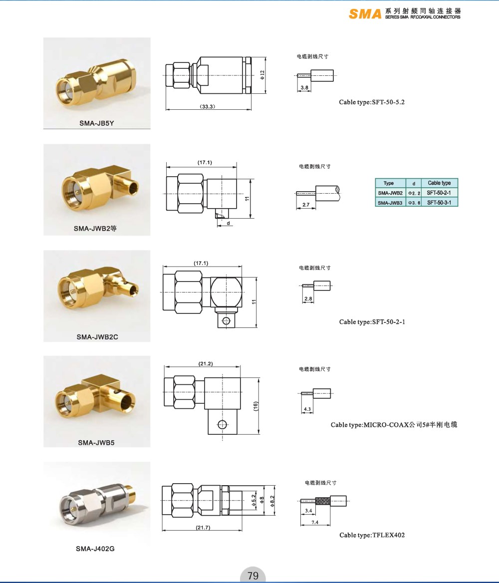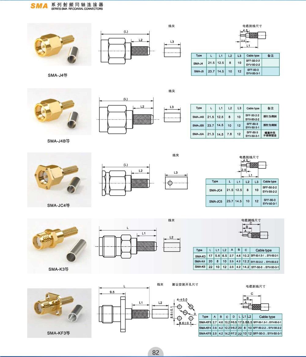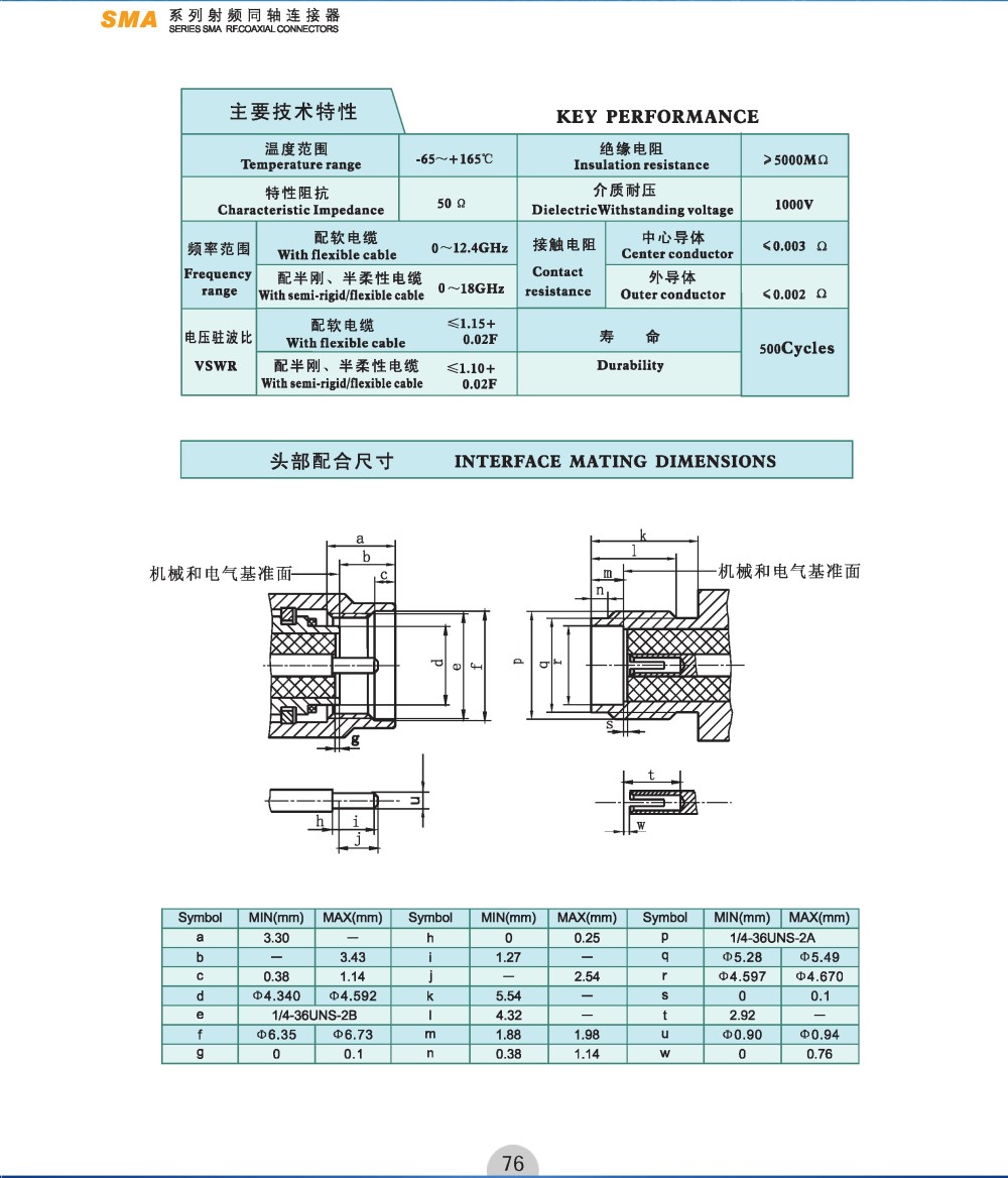 产品描述:SMA射频同轴连接器具有体积小、频带宽、机械电气性能优越、可靠性高等优点,是应用最广的射频连接器。广泛应用于微波通讯,航天航海,武器系统及微波测量设备等领域,