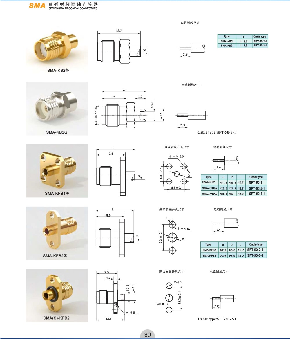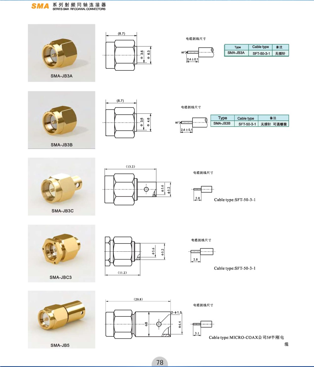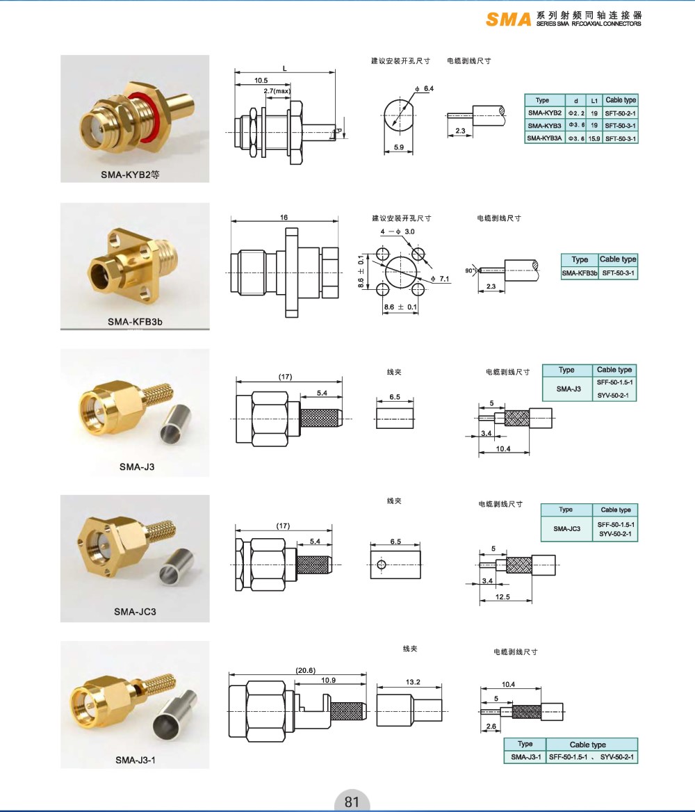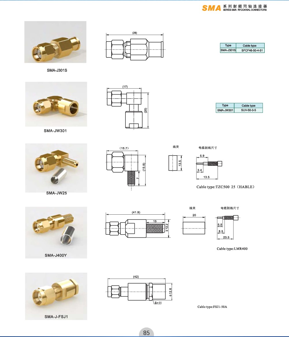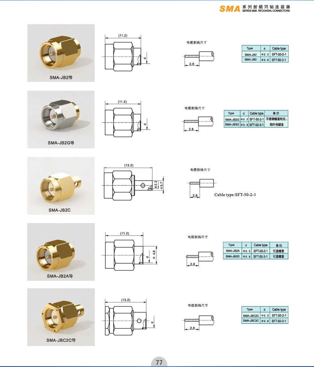 产品描述:SMA射频同轴连接器具有体积小、频带宽、机械电气性能优越、可靠性高等优点,是应用最广的射频连接器。广泛应用于微波通讯,航天航海,武器系统及微波测量设备等领域,
