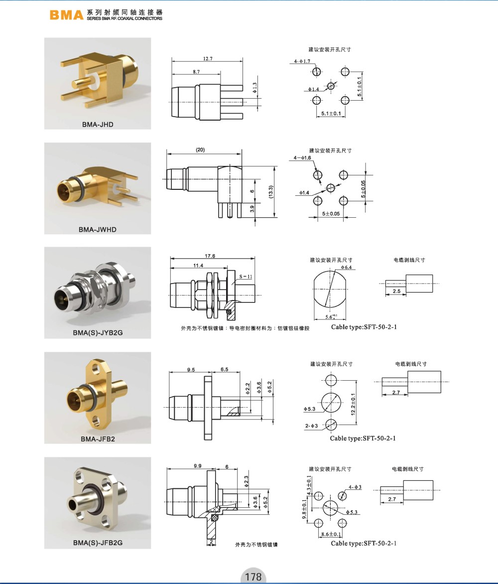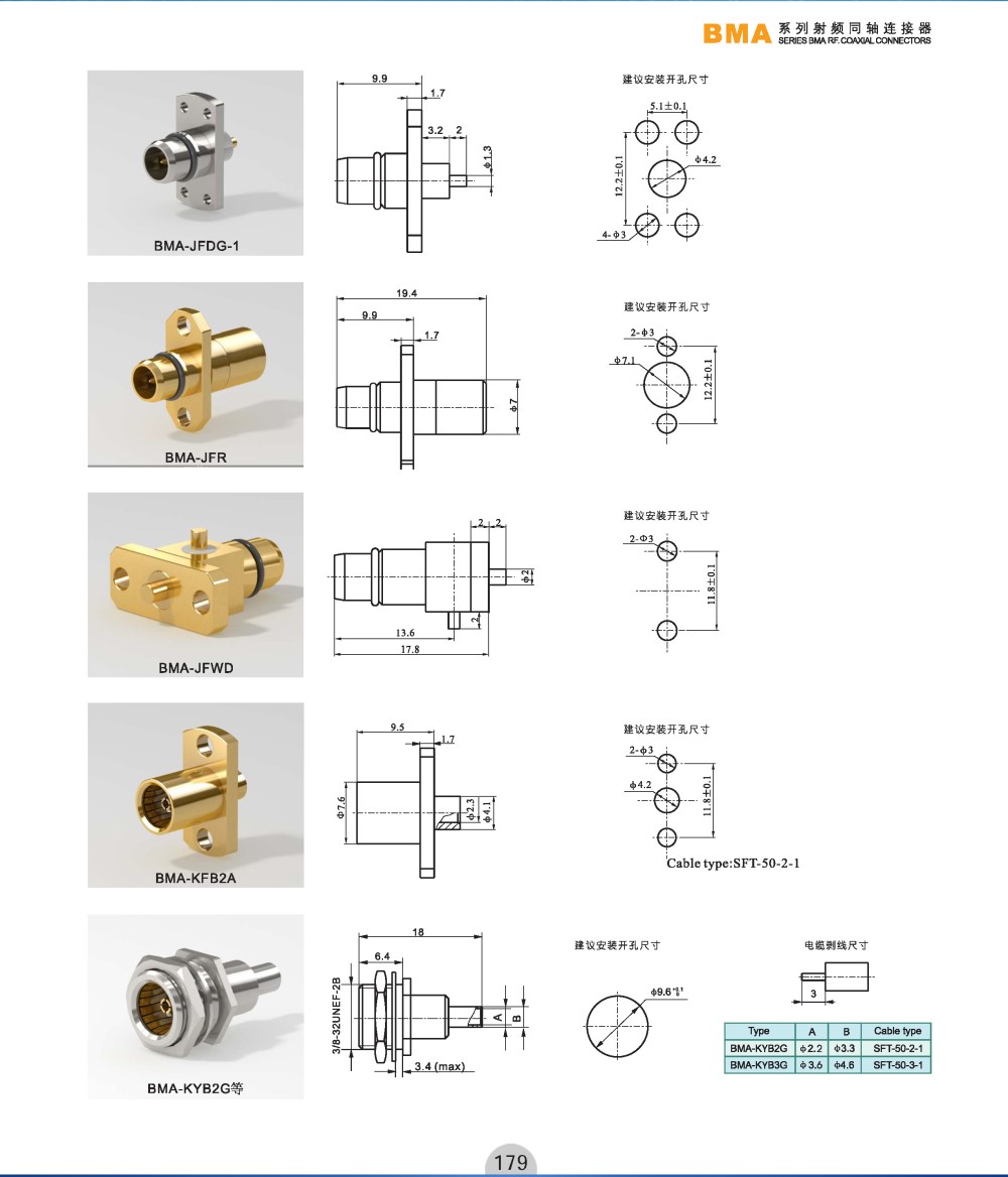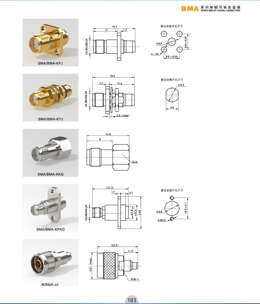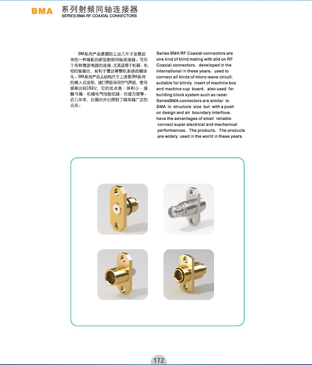 BMA系列产品是国际上这几年才发展起来的一种盲配的新型射频同轴连接器。可用于各种微波电路的连接,尤其适用于机箱、机柜的盲插合,有利于雷达等整机系统的模块化。BMA系列产品从结构尺寸上讲是SMA系列的推入式变形,接口界面采用空气界面,使用频率达到18GHz,它的优点是:体积小、接触可靠、机械电气性能优越、对接方便等。近几年来,在国内外已得到了越来越广泛的应用。