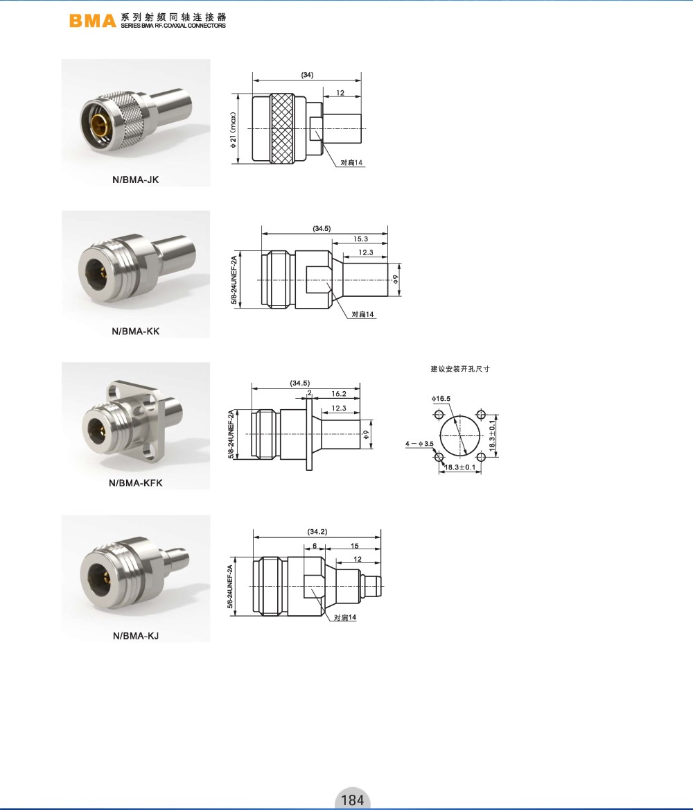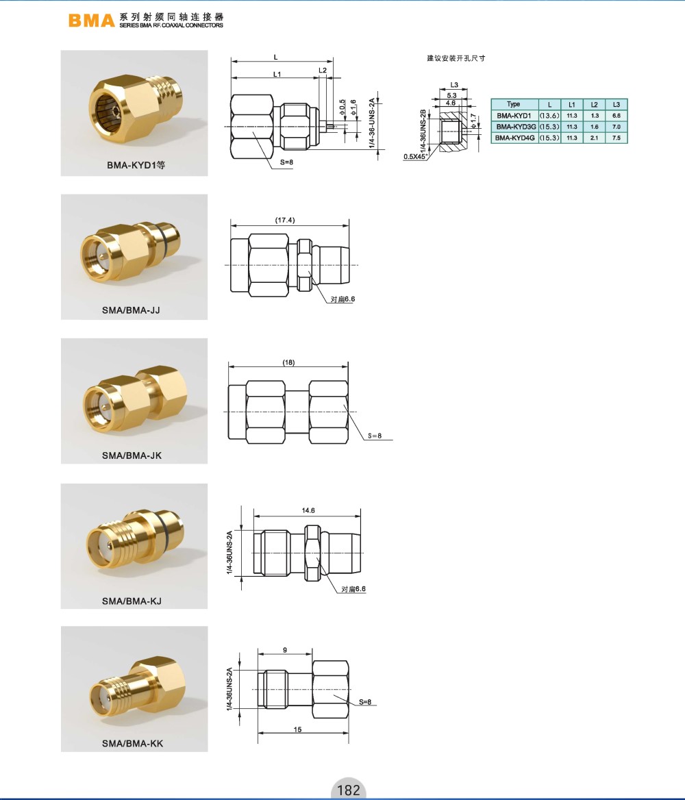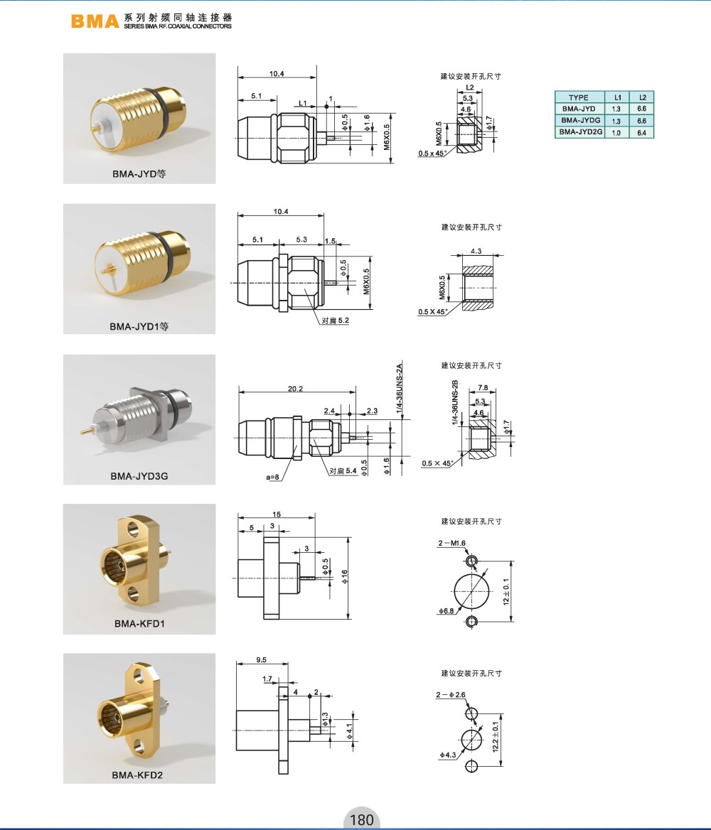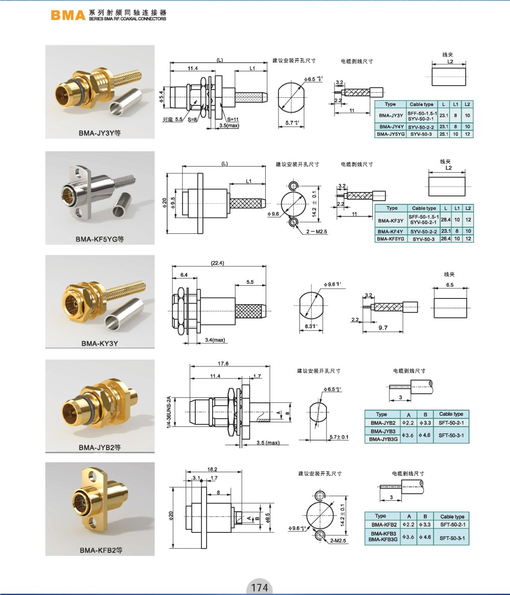 BMA系列产品是国际上这几年才发展起来的一种盲配的新型射频同轴连接器。可用于各种微波电路的连接,尤其适用于机箱、机柜的盲插合,有利于雷达等整机系统的模块化。BMA系列产品从结构尺寸上讲是SMA系列的推入式变形,接口界面采用空气界面,使用频率达到18GHz,它的优点是:体积小、接触可靠、机械电气性能优越、对接方便等。近几年来,在国内外已得到了越来越广泛的应用。