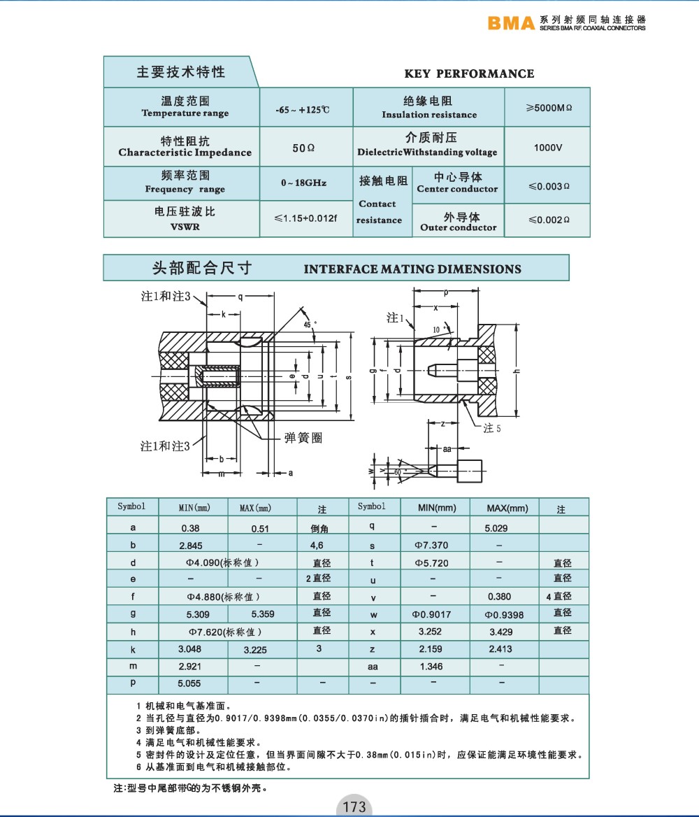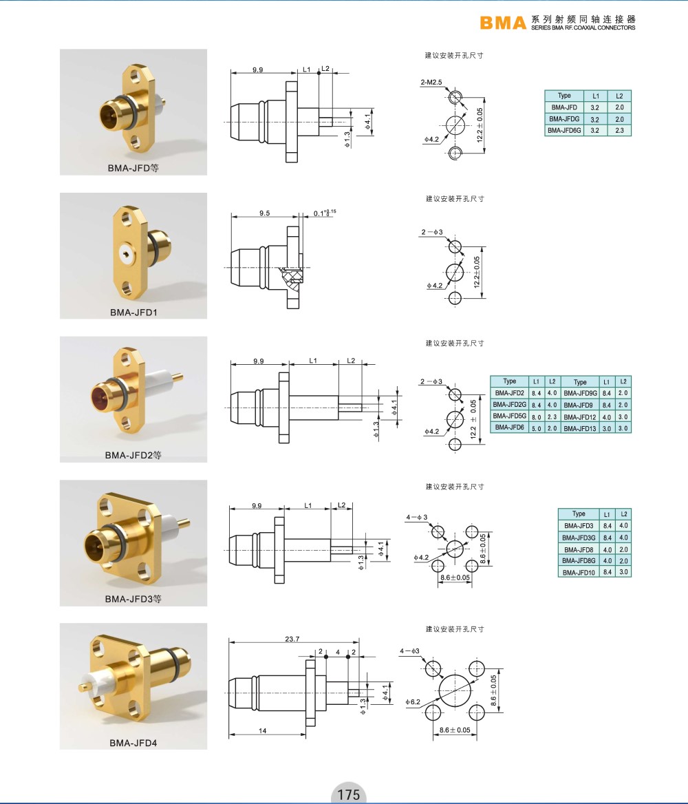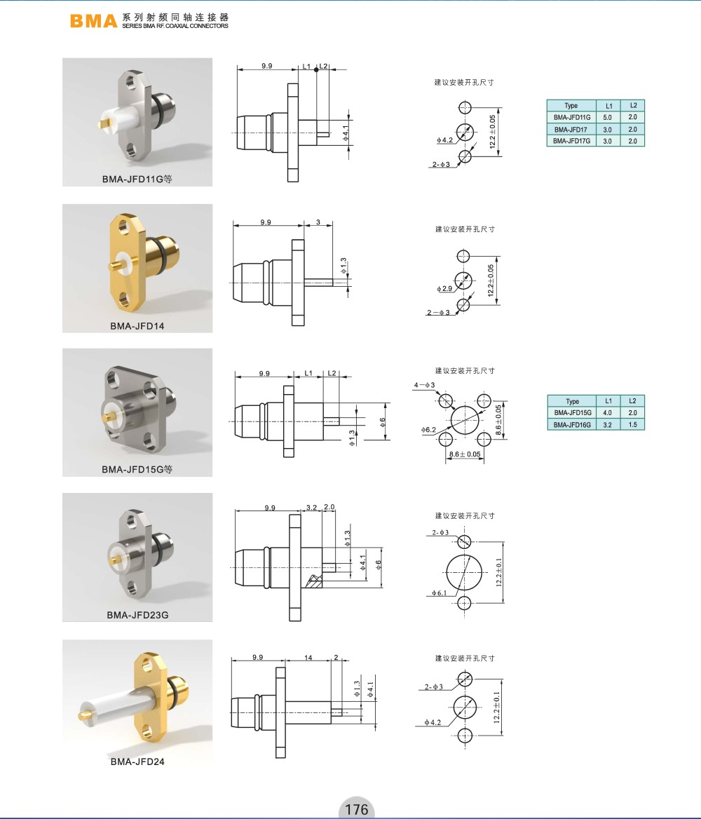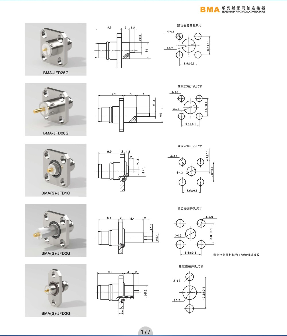 产品描述:BMA系列产品是国际上这几年才发展起来的一种盲配的新型射频同轴连接器。可用于各种微波电路的连接,尤其适用于机箱、机柜的盲插合,有利于雷达等整机系统的模块化。BMA系列产品从结构尺寸上讲是SMA系列的推入式变形,接口界面采用空气界面,使用频率达到18GHz,它的优点是:体积小、接触可靠、机械电气性能优越、对接方便等。