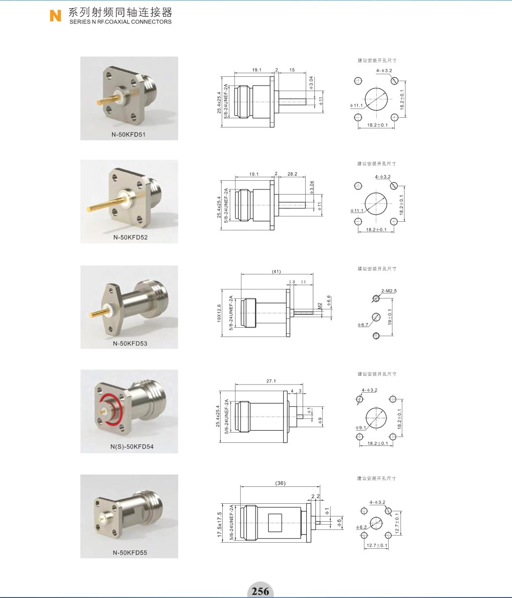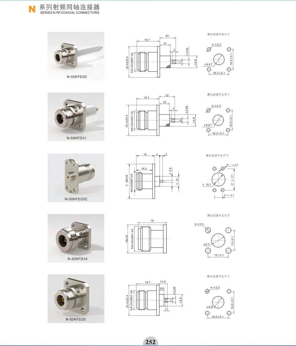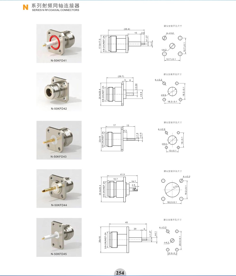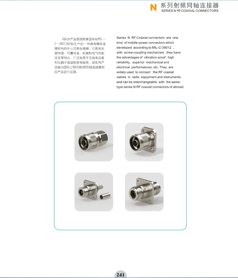 N系列产品是按照美国军标MIL一C一39012研制生产的一种具有螺纹连接机构的中小功率连接器。它具有抗振性强、可靠性高、机械和电气性能优良等特点,广泛地用于无线电设备和仪器中连接射频电缆用。该系列产品能与国际上N系列射频同轴连接器相应产品进行互换。
