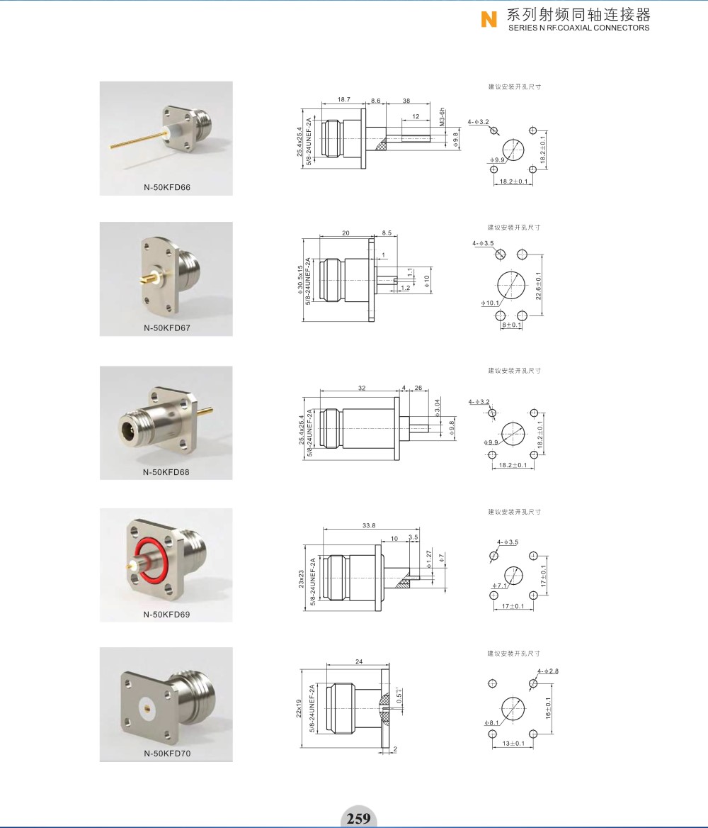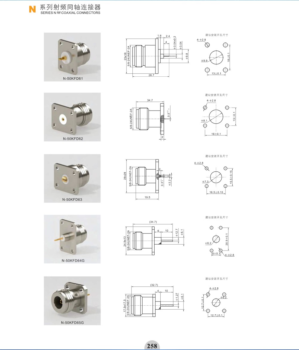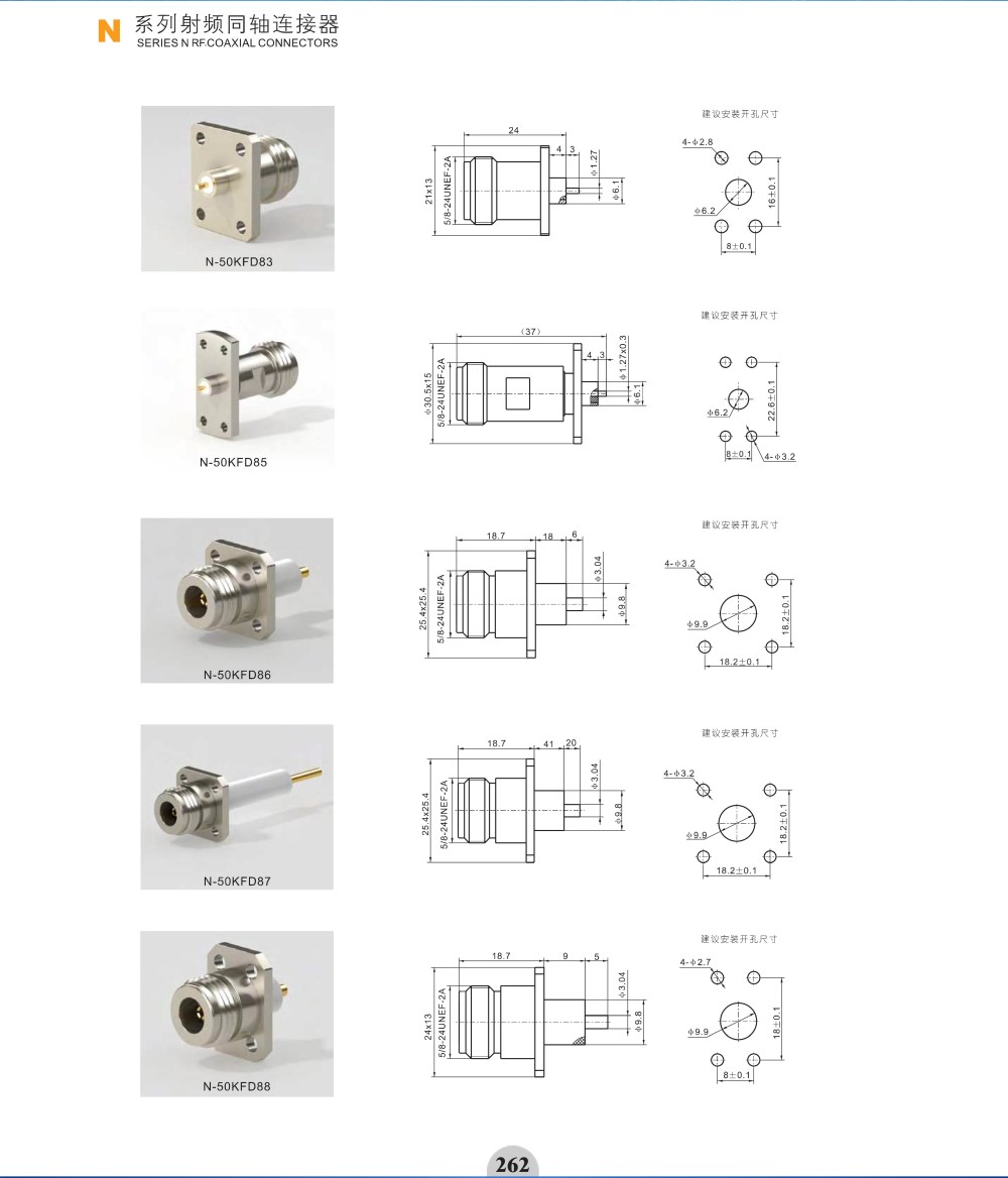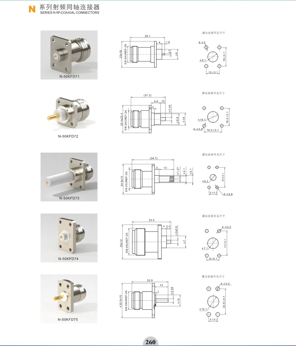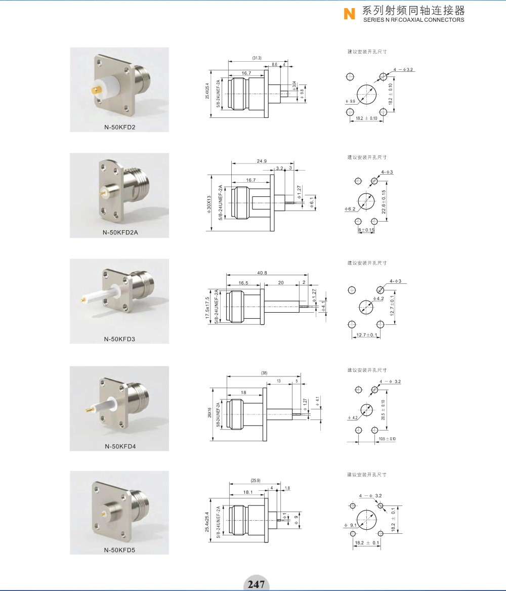 N系列产品是按照美国军标MIL一C一39012研制生产的一种具有螺纹连接机构的中小功率连接器。它具有抗振性强、可靠性高、机械和电气性能优良等特点,广泛地用于无线电设备和仪器中连接射频电缆用。该系列产品能与国际上N系列射频同轴连接器相应产品进行互换。