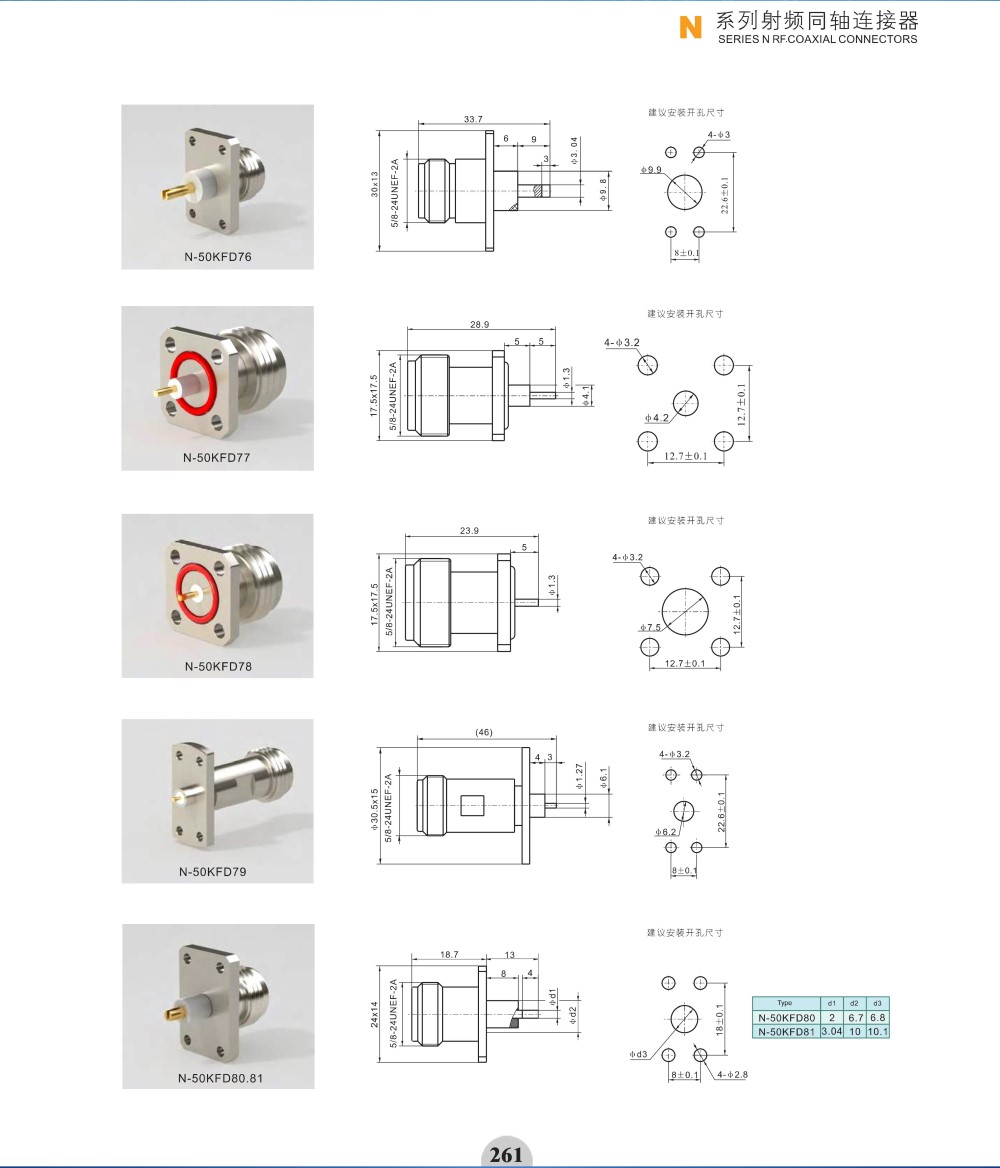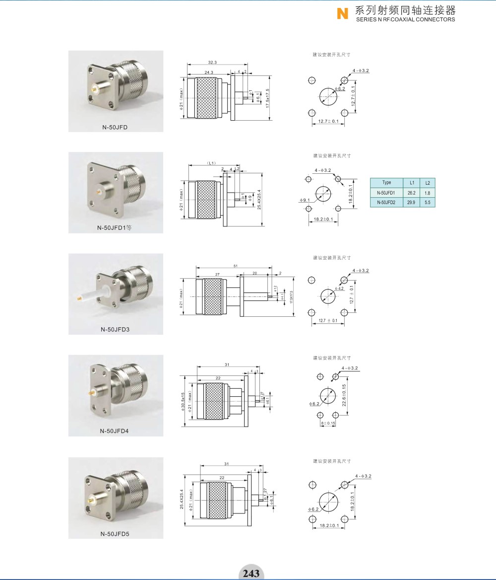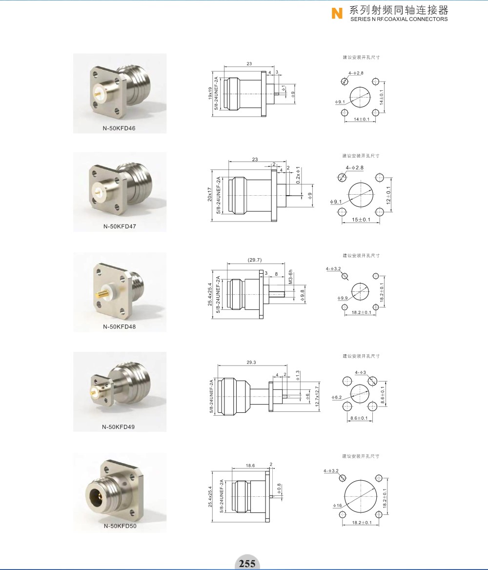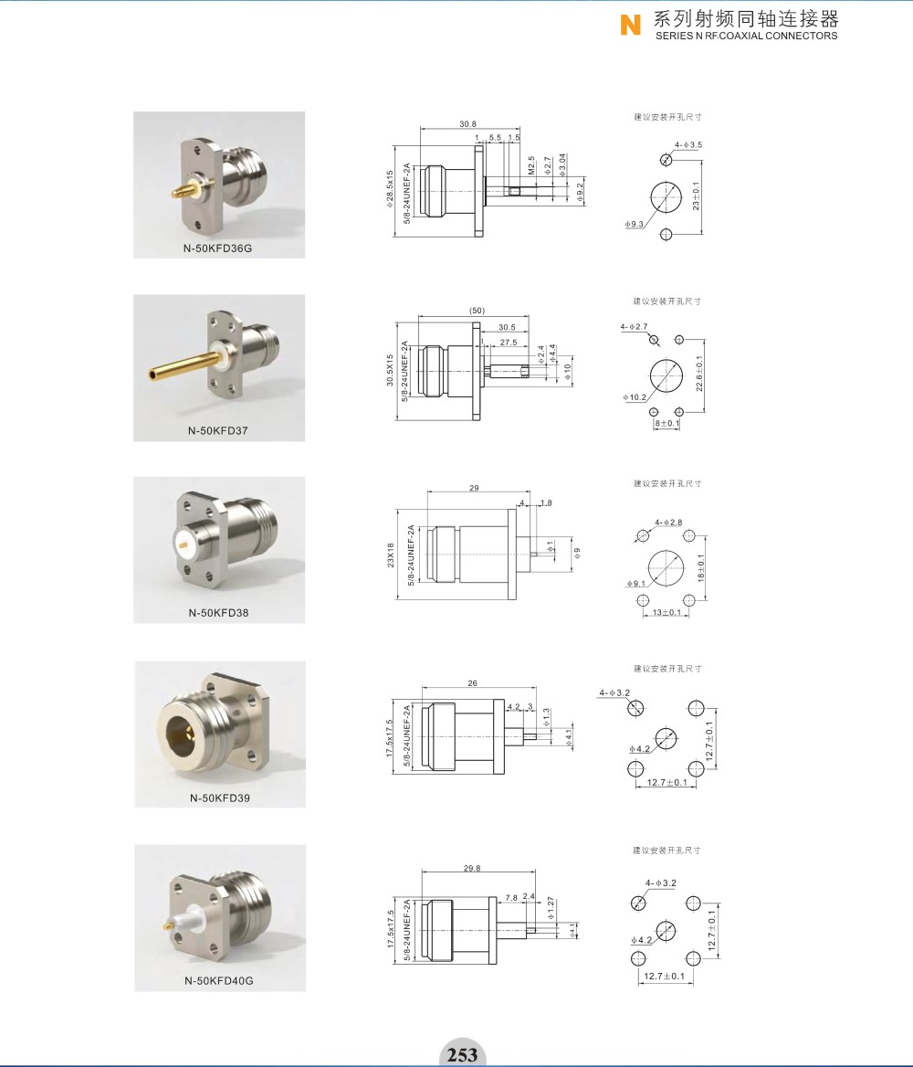 N系列产品是按照美国军标MIL一C一39012研制生产的一种具有螺纹连接机构的中小功率连接器。它具有抗振性强、可靠性高、机械和电气性能优良等特点,广泛地用于无线电设备和仪器中连接射频电缆用。该系列产品能与国际上N系列射频同轴连接器相应产品进行互换。
