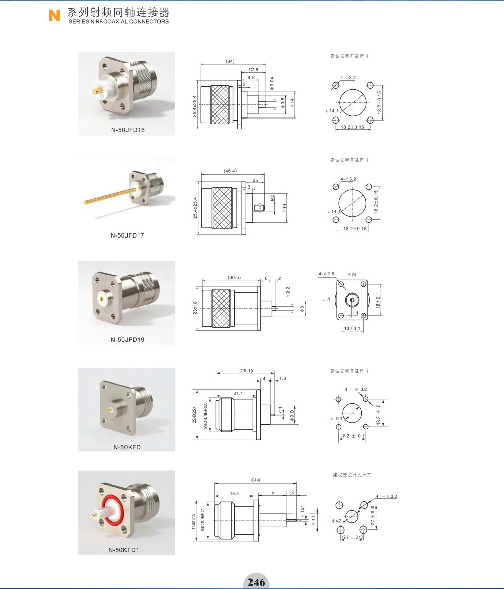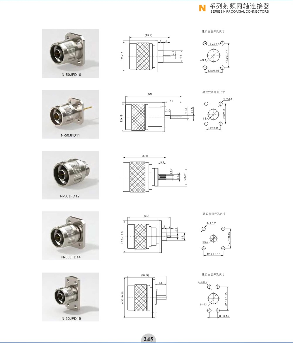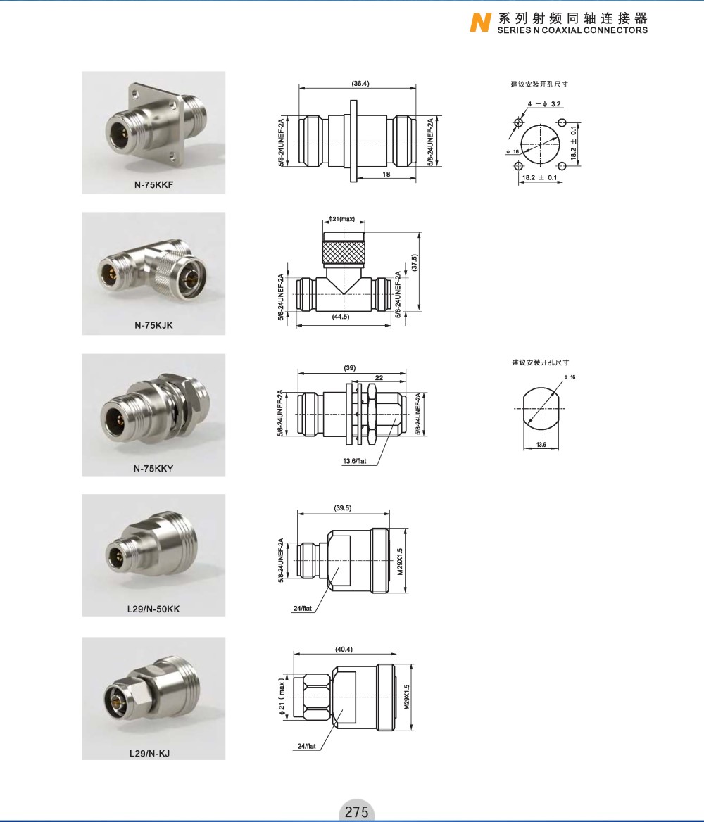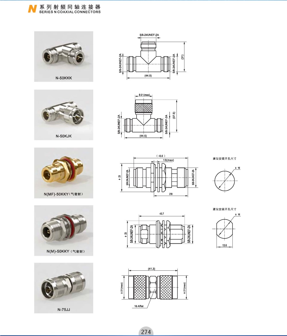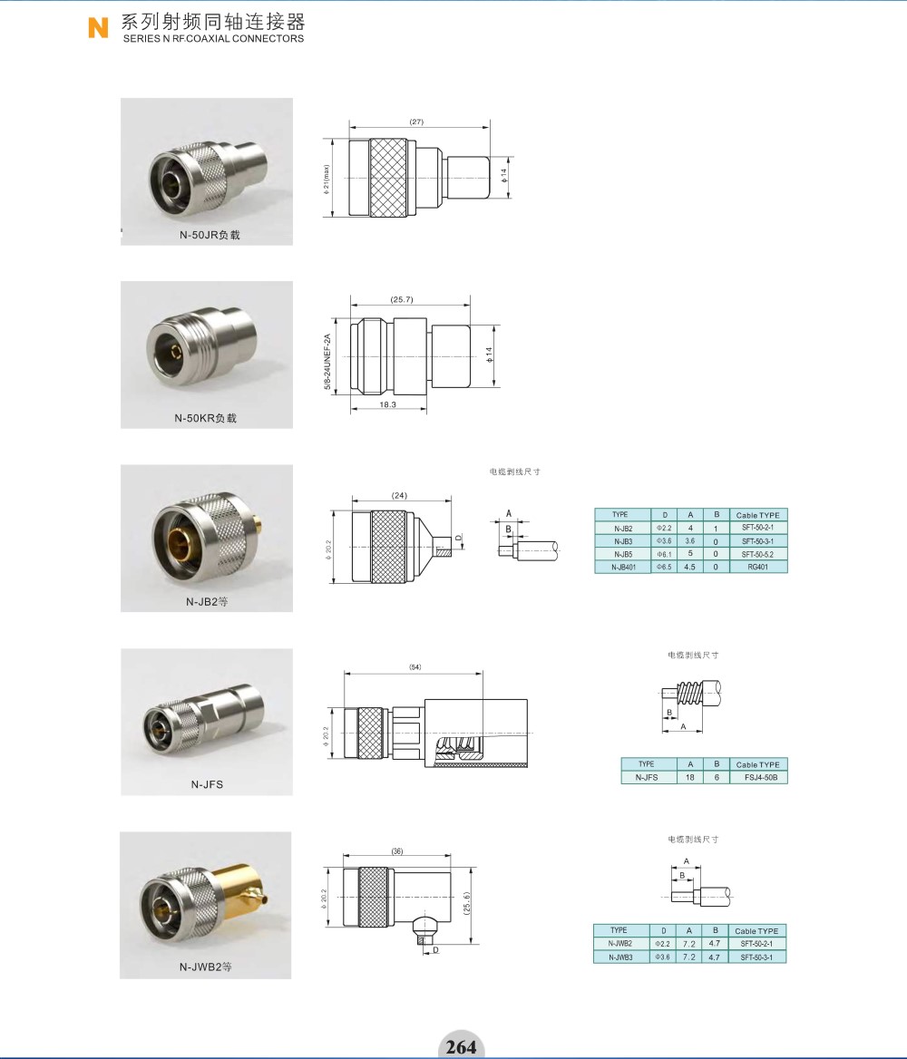 产品描述:N系列产品是按照美国军标MIL一C一39012研制生产的一种具有螺纹连接机构的中小功率连接器。它具有抗振性强、可靠性高、机械和电气性能优良等特点,广泛地用于无线电设备和仪器中连接射频电缆用。该系列产品能与国际上N系列射频同轴连接器相应产品进行互换。
