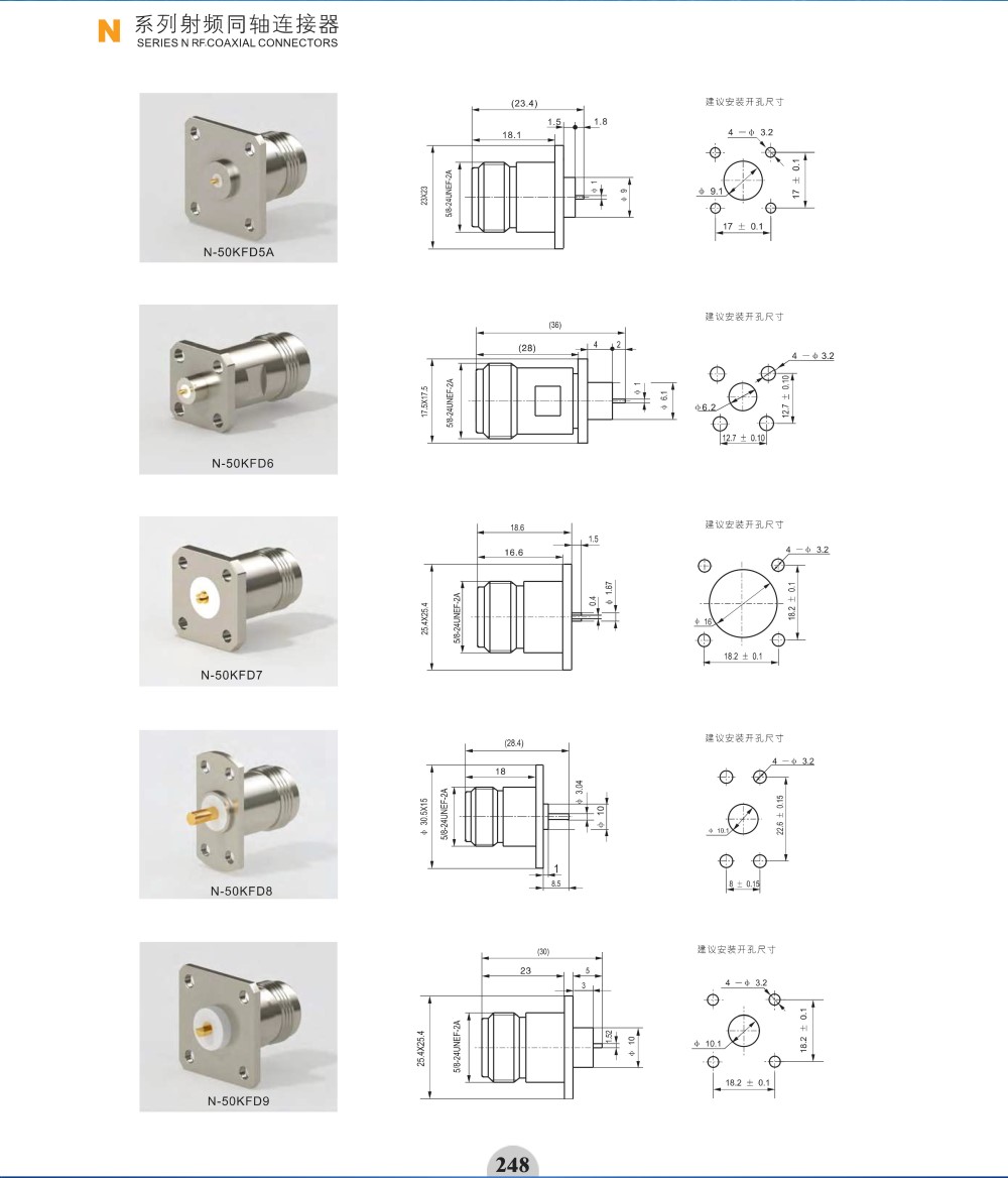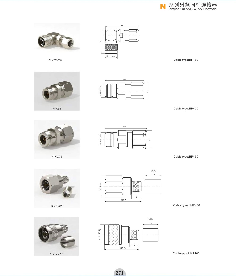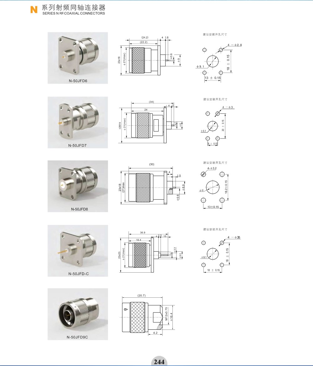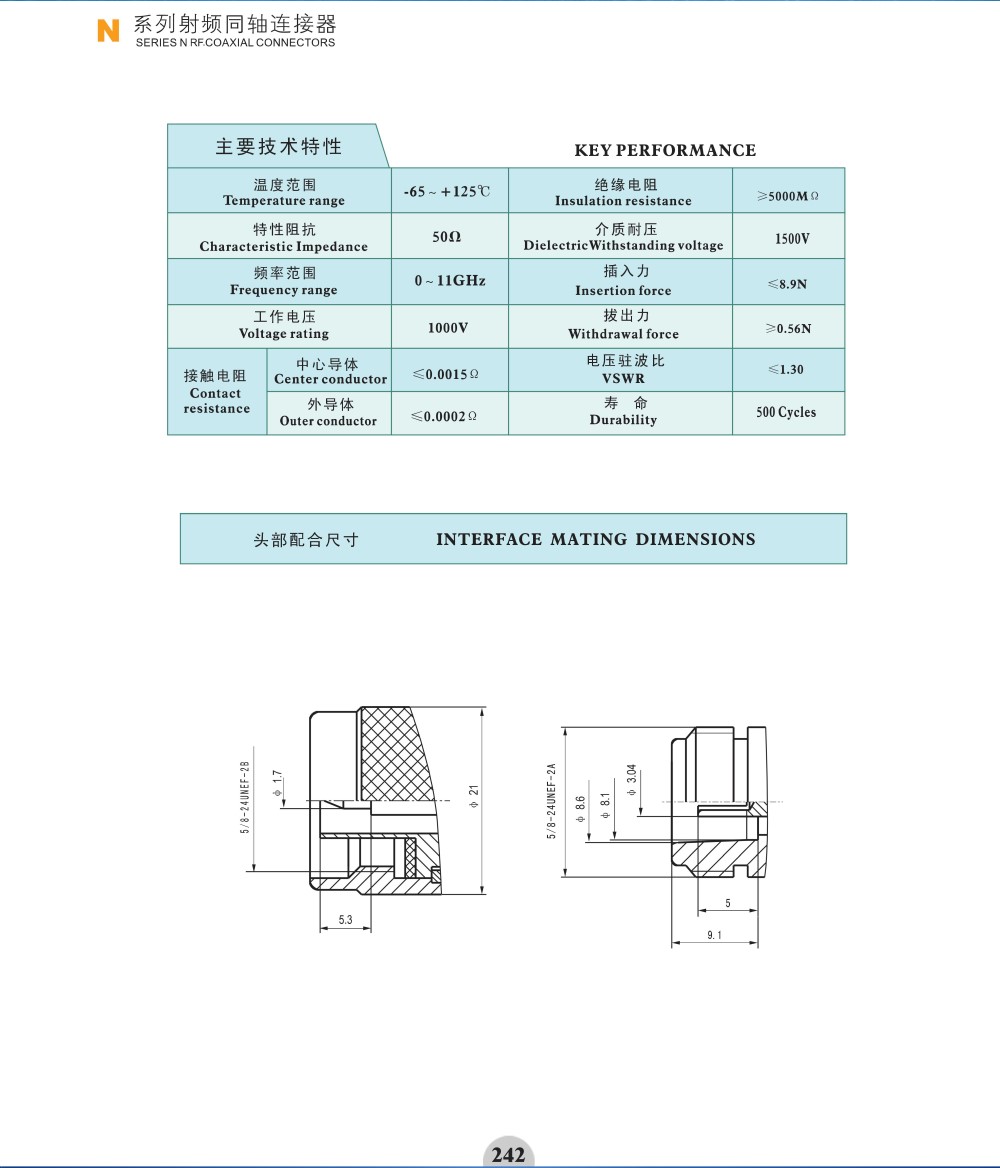 产品描述:N系列产品是按照美国军标MIL一C一39012研制生产的一种具有螺纹连接机构的中小功率连接器。它具有抗振性强、可靠性高、机械和电气性能优良等特点,广泛地用于无线电设备和仪器中连接射频电缆用。该系列产品能与国际上N系列射频同轴连接器相应产品进行互换。