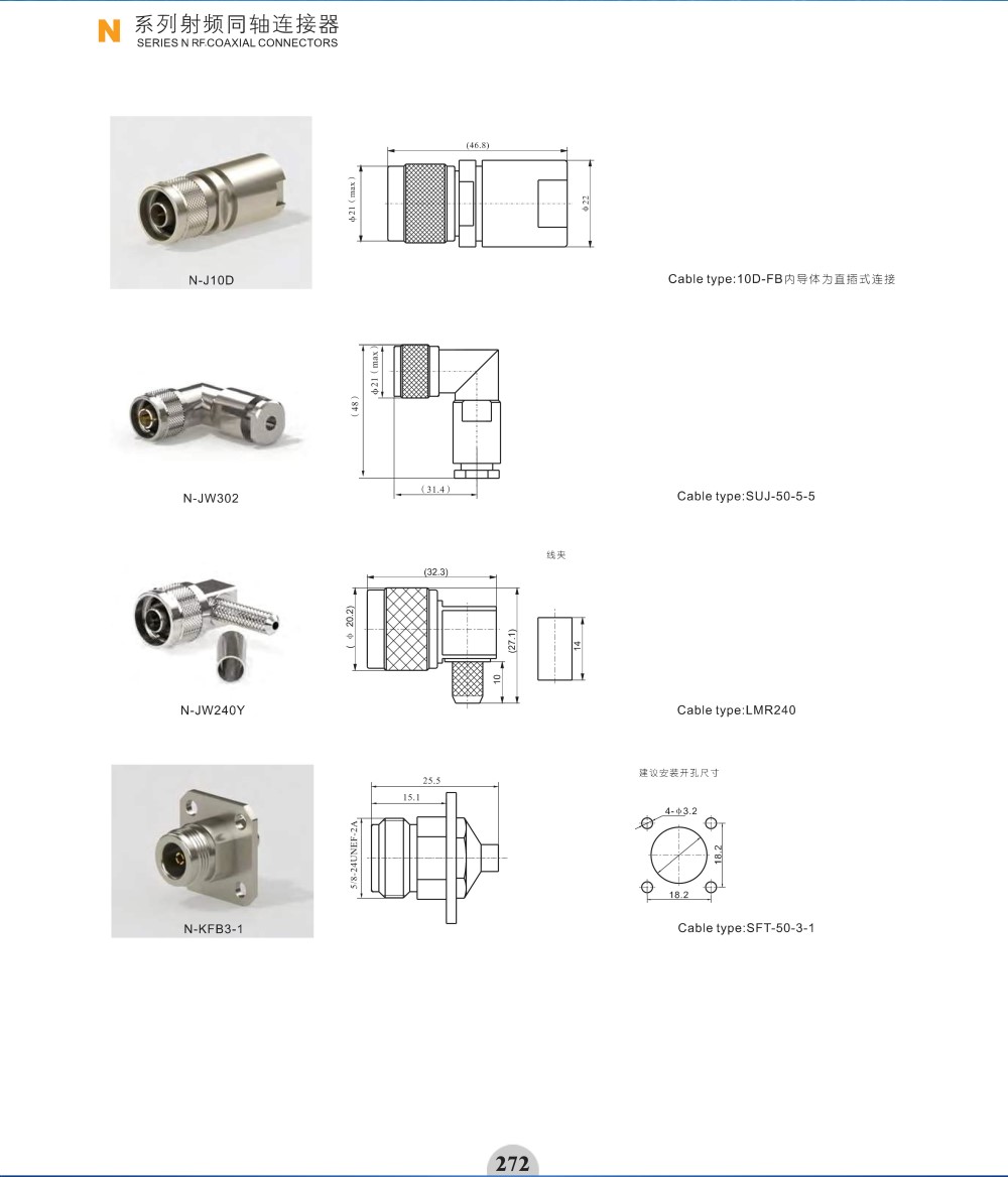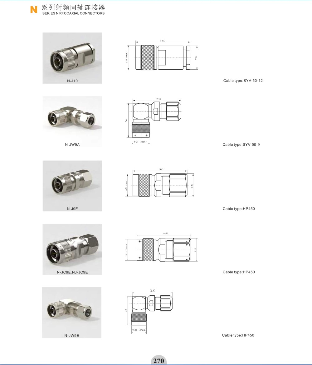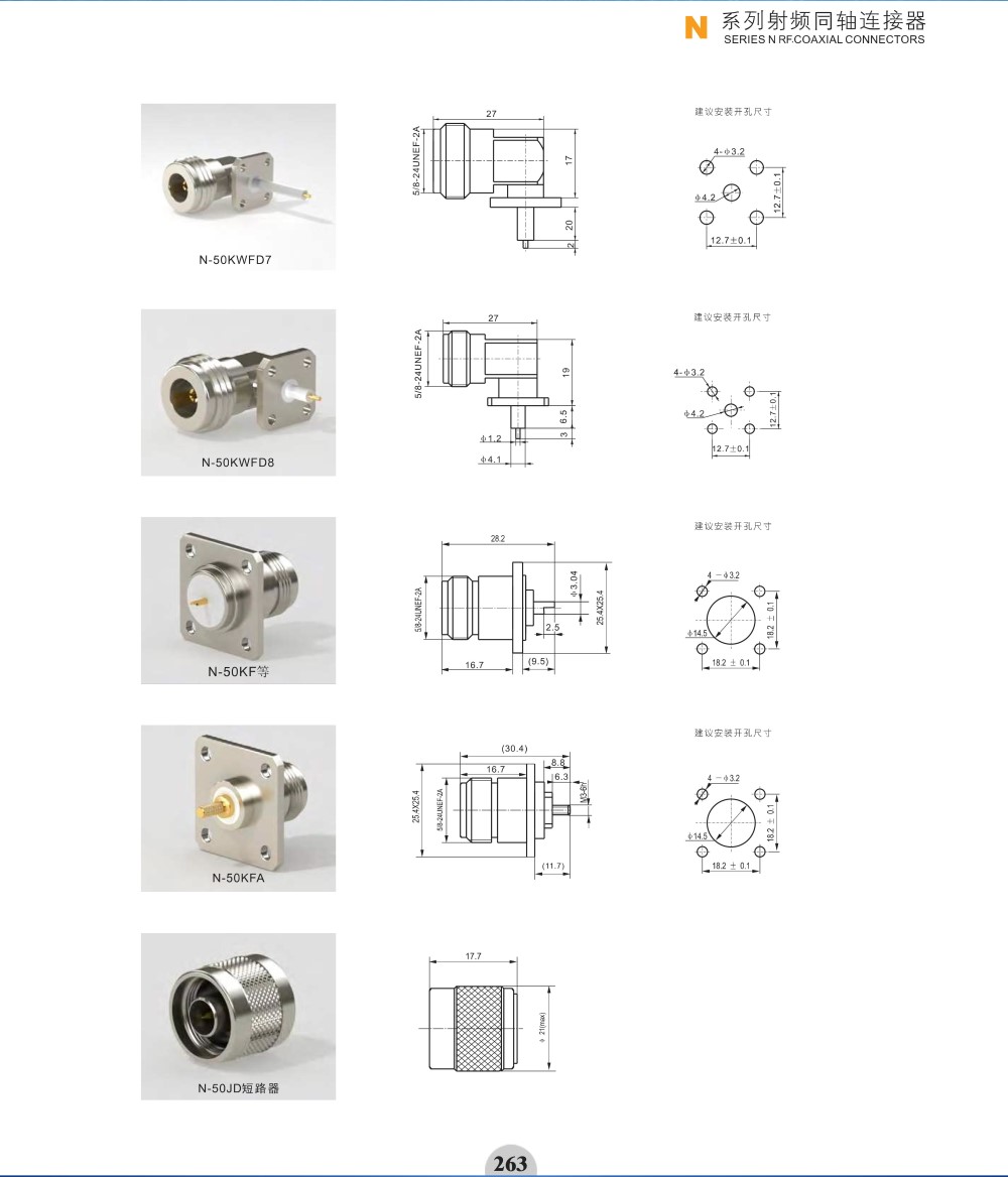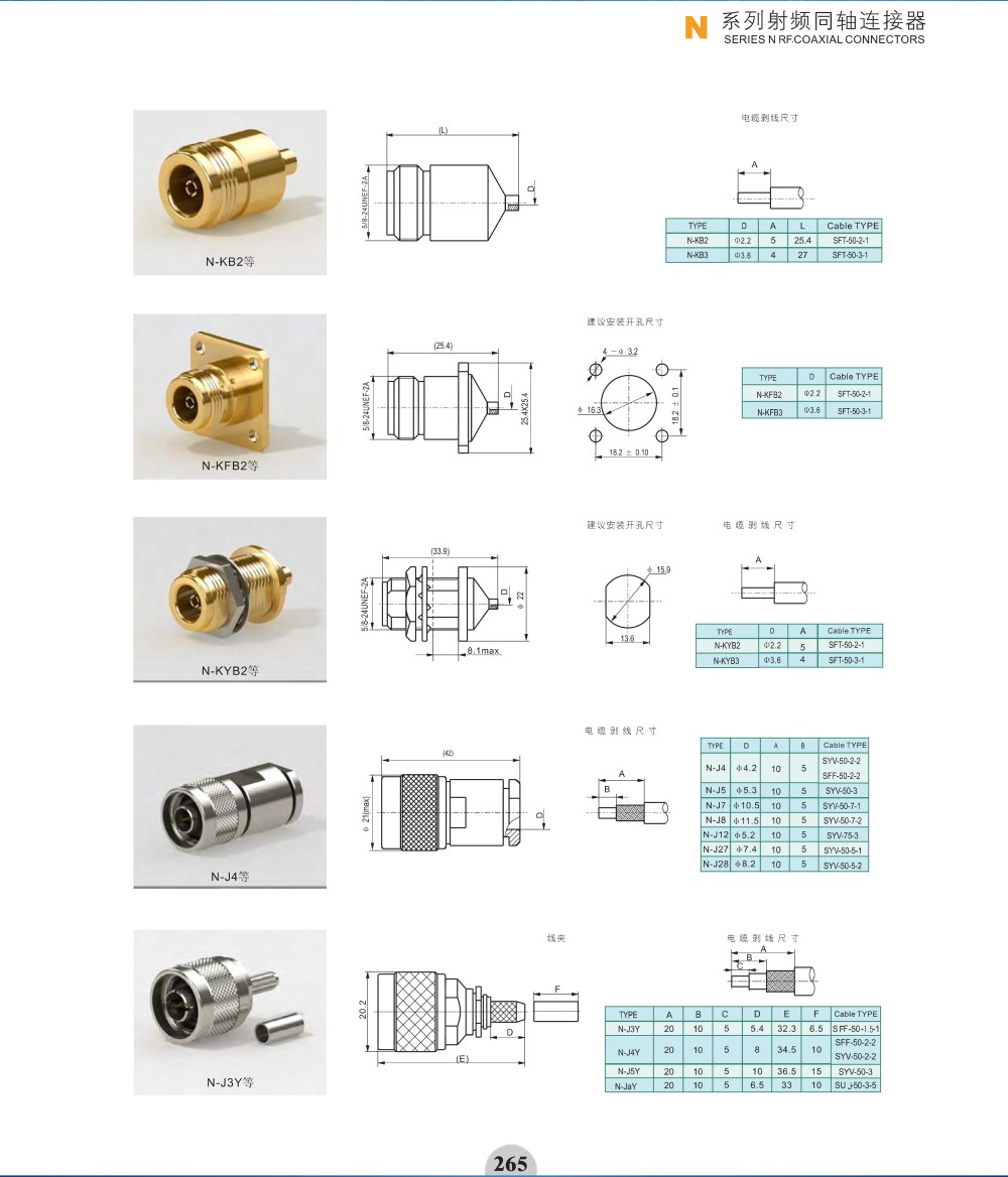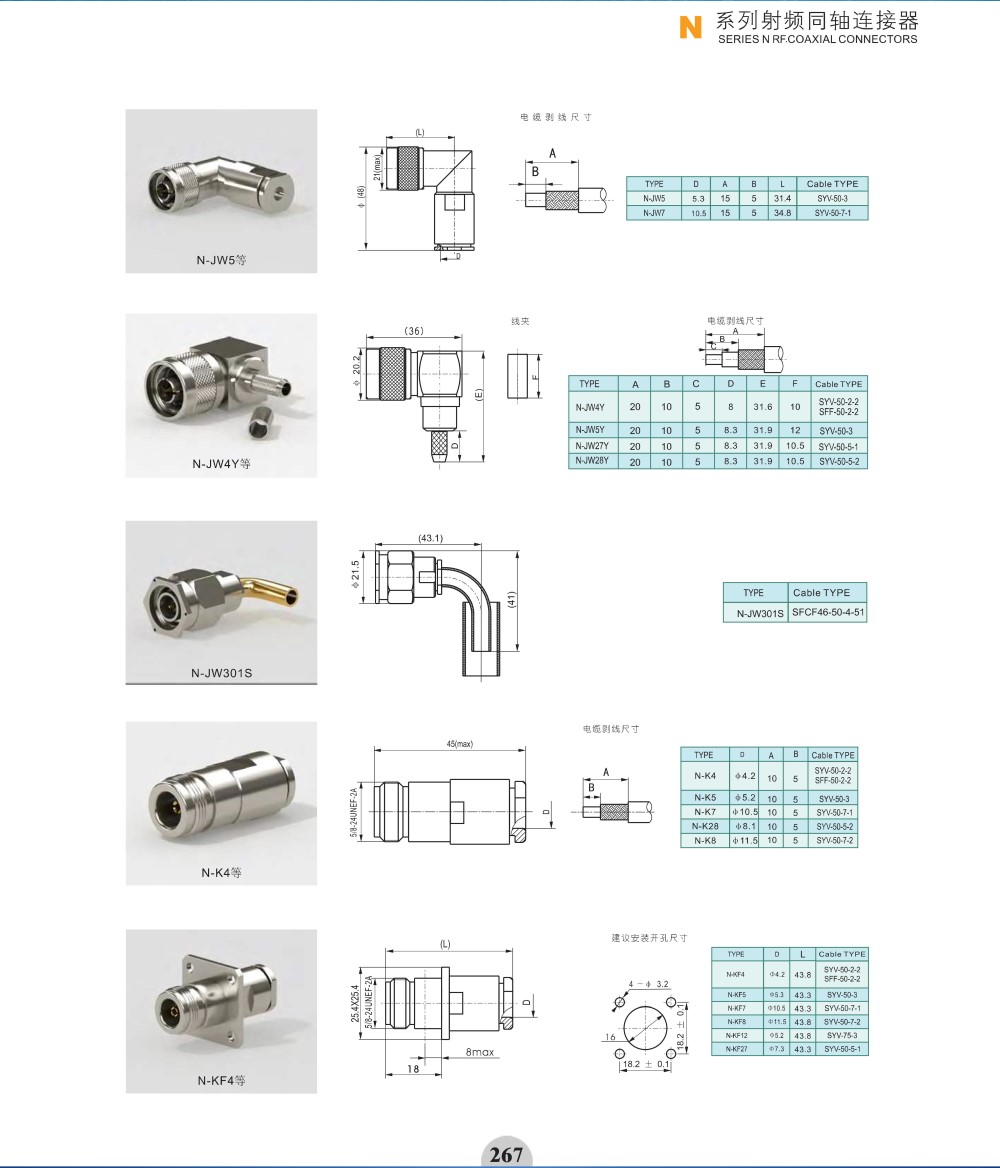 产品描述:N系列产品是按照美国军标MIL一C一39012研制生产的一种具有螺纹连接机构的中小功率连接器。它具有抗振性强、可靠性高、机械和电气性能优良等特点,广泛地用于无线电设备和仪器中连接射频电缆用。该系列产品能与国际上N系列射频同轴连接器相应产品进行互换。