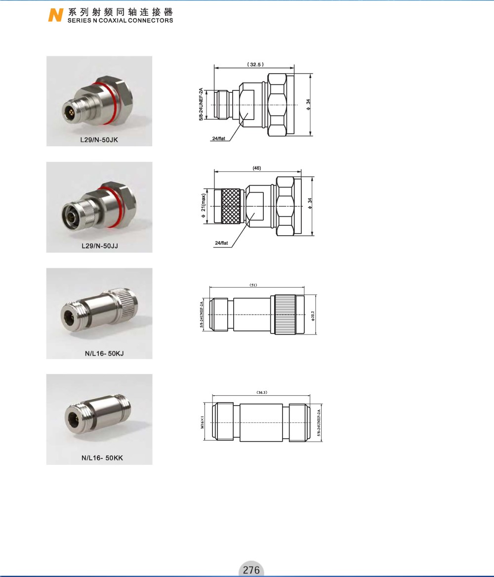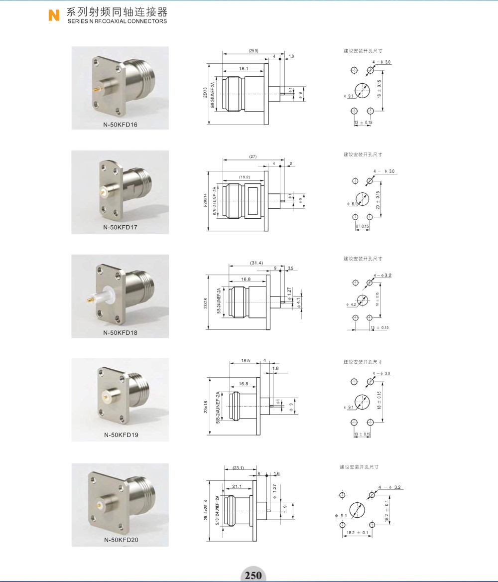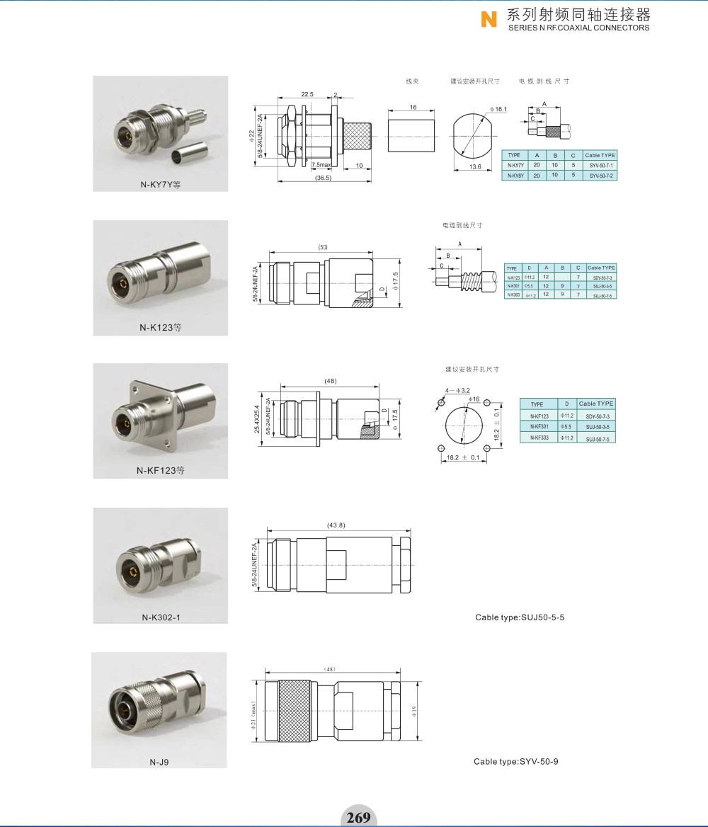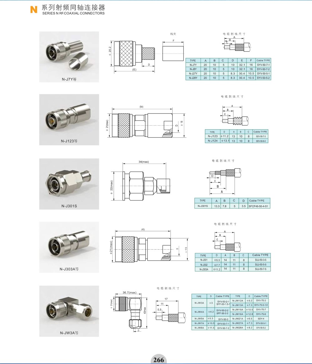 产品描述:N系列产品是按照美国军标MIL一C一39012研制生产的一种具有螺纹连接机构的中小功率连接器。它具有抗振性强、可靠性高、机械和电气性能优良等特点,广泛地用于无线电设备和仪器中连接射频电缆用。该系列产品能与国际上N系列射频同轴连接器相应产品进行互换。