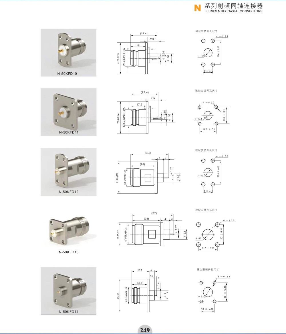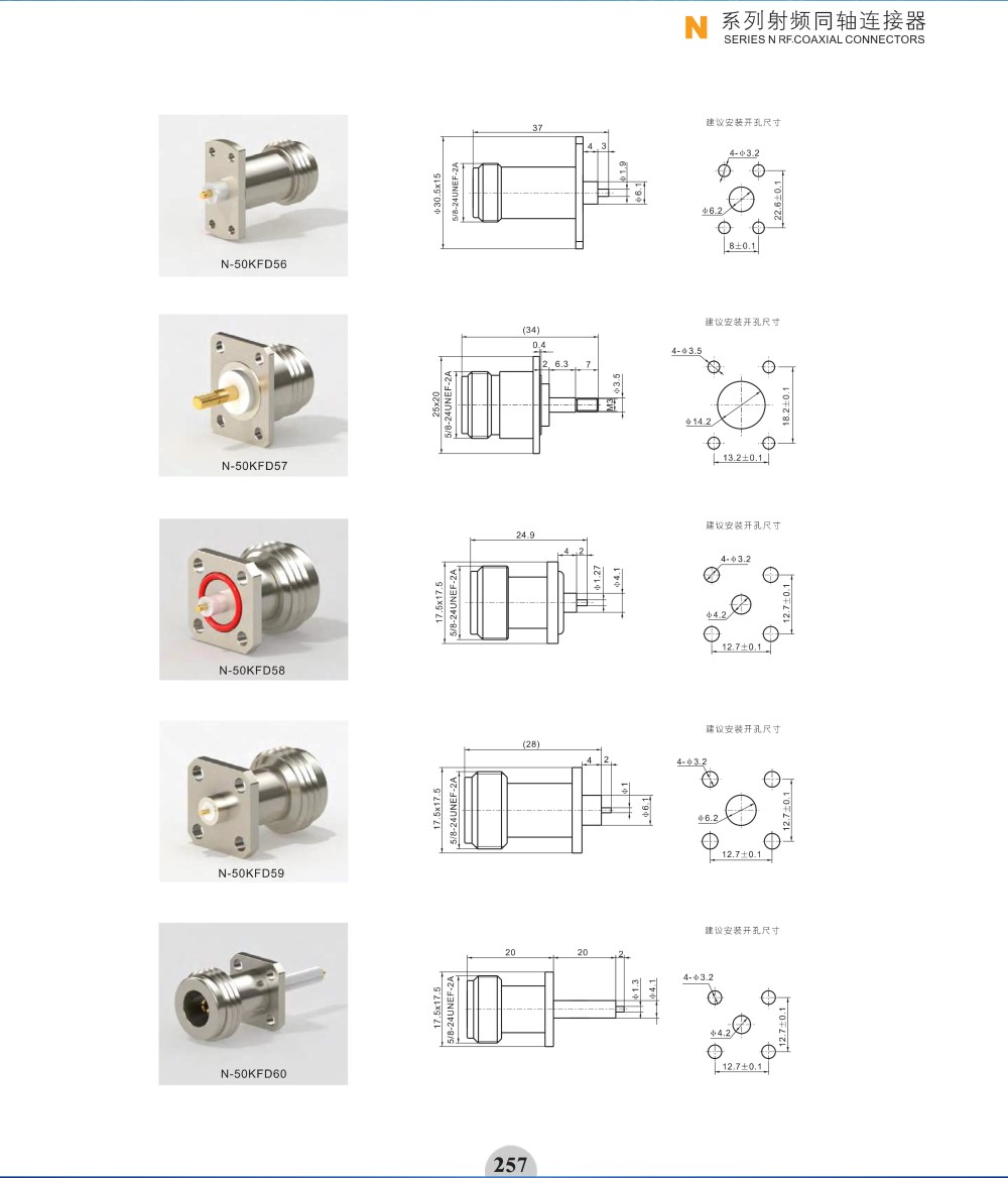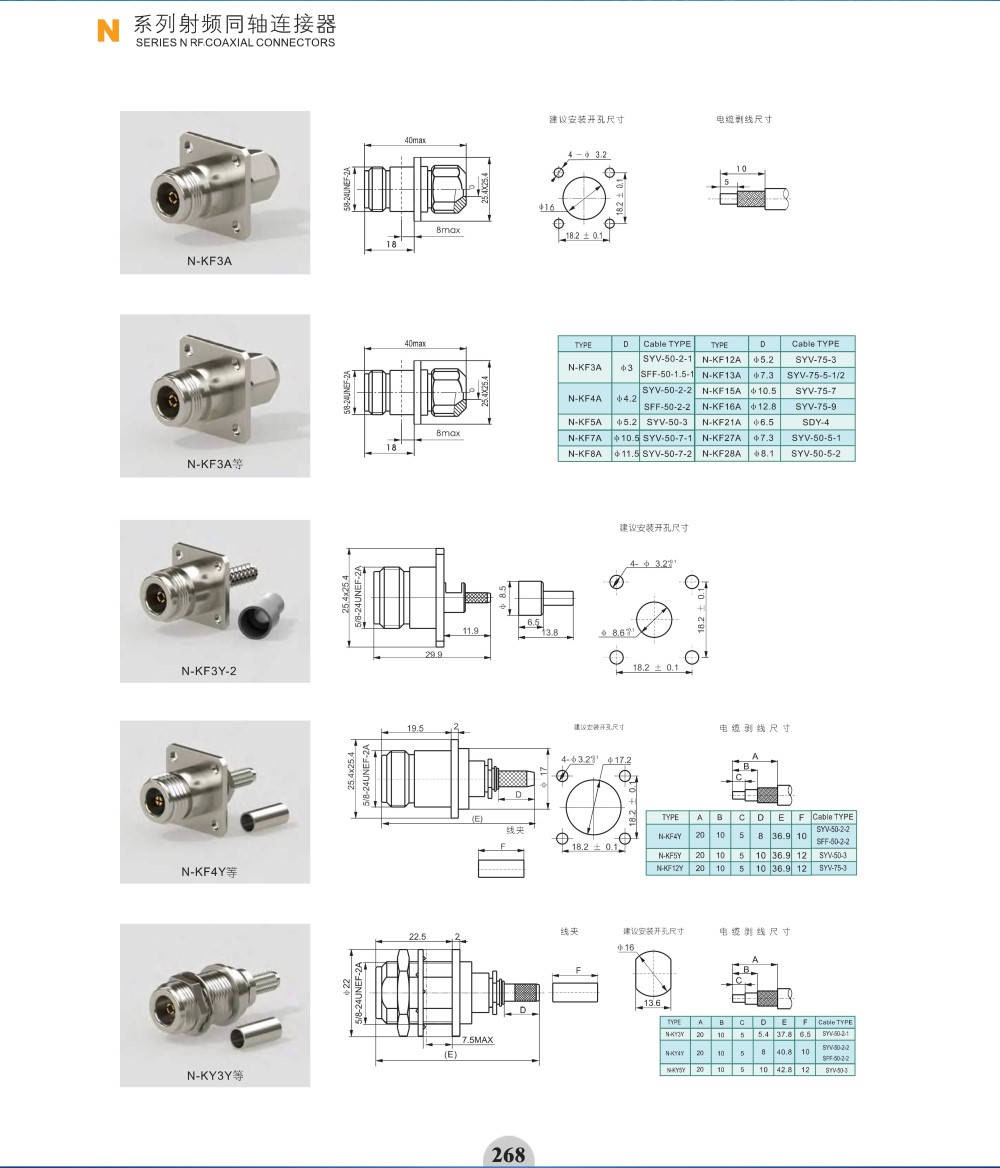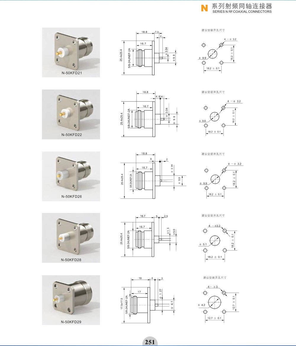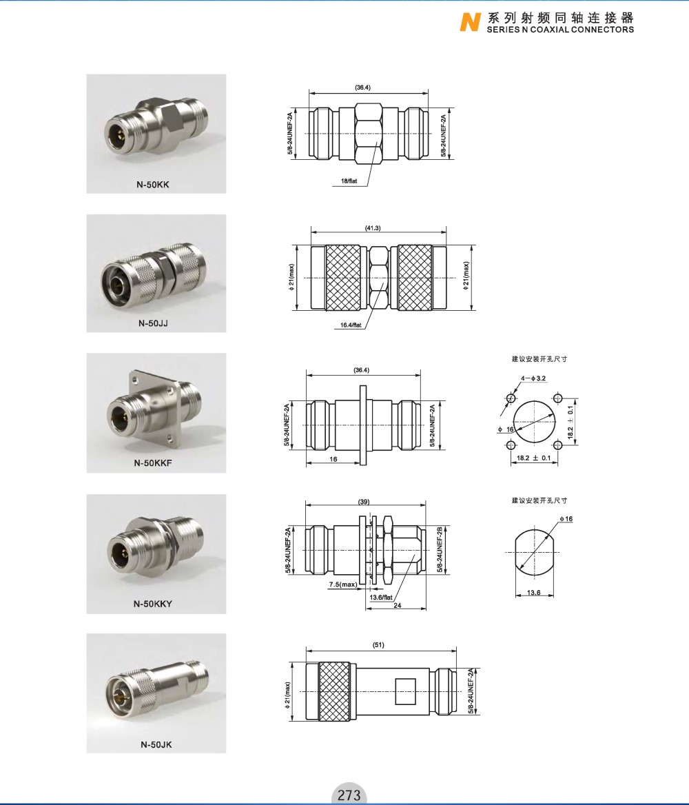 产品描述:N系列产品是按照美国军标MIL一C一39012研制生产的一种具有螺纹连接机构的中小功率连接器。它具有抗振性强、可靠性高、机械和电气性能优良等特点,广泛地用于无线电设备和仪器中连接射频电缆用。该系列产品能与国际上N系列射频同轴连接器相应产品进行互换。