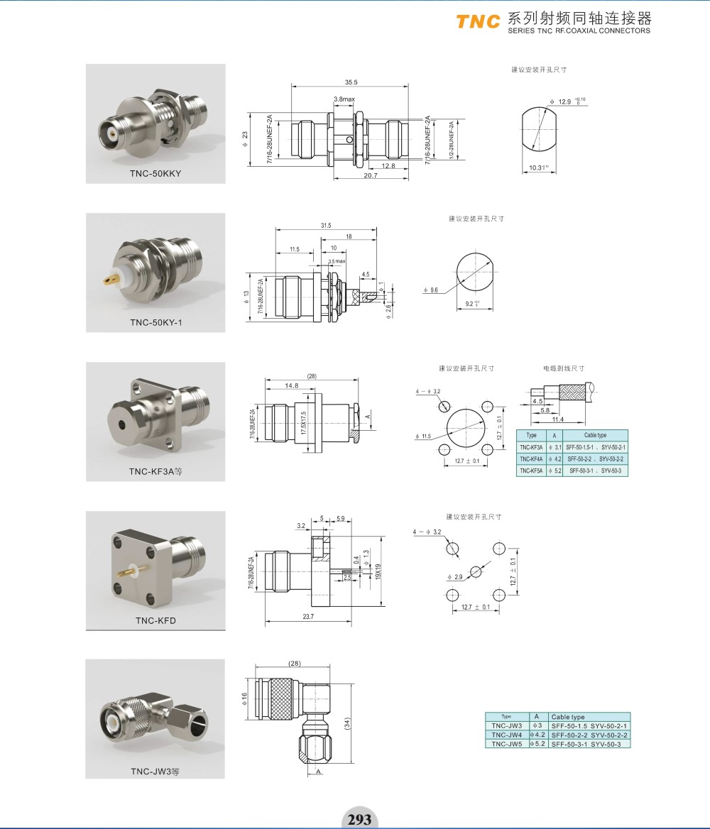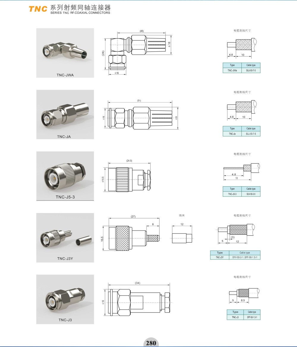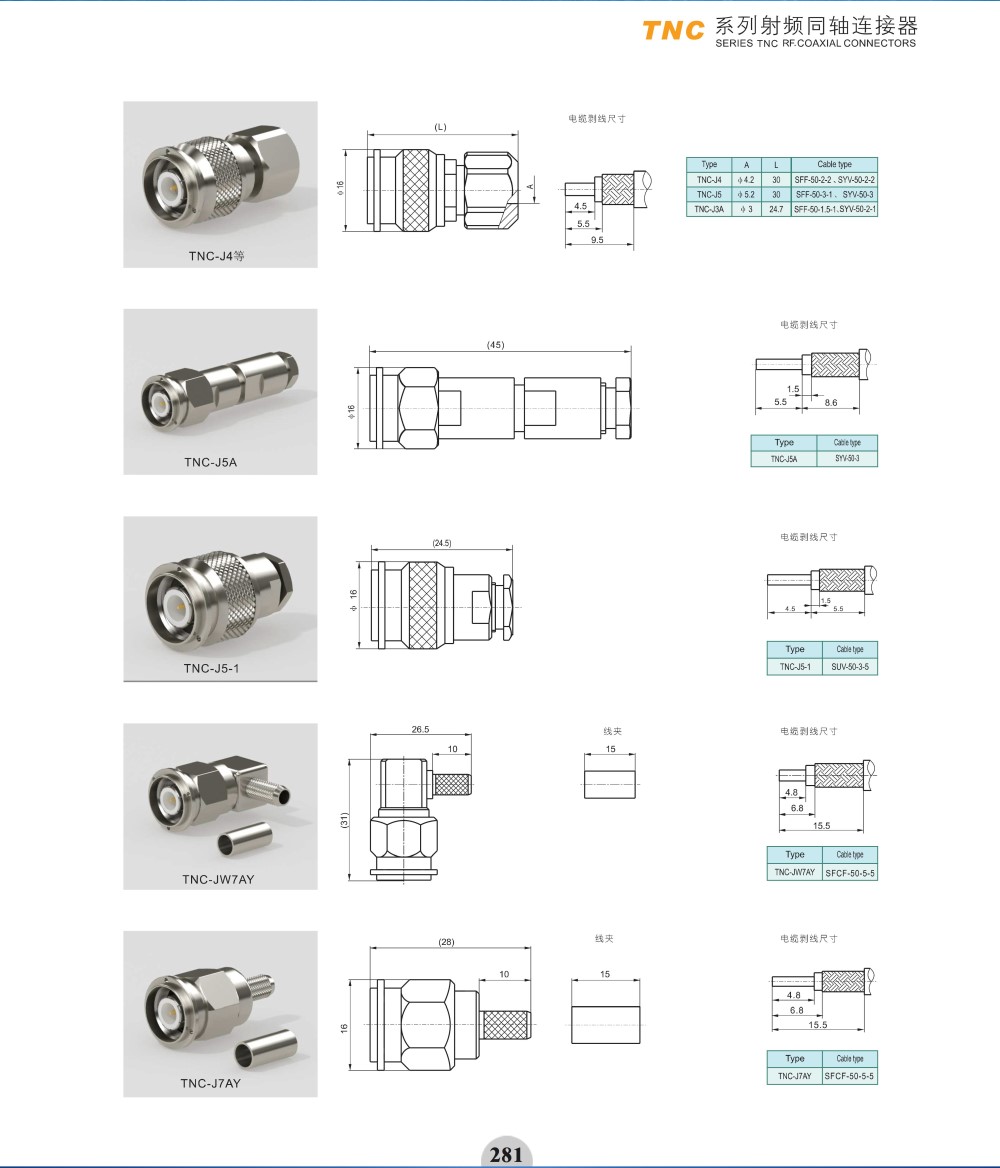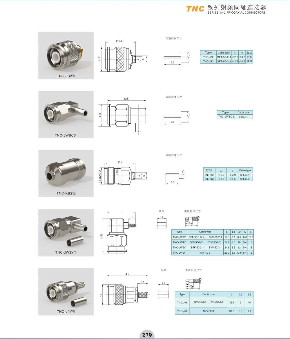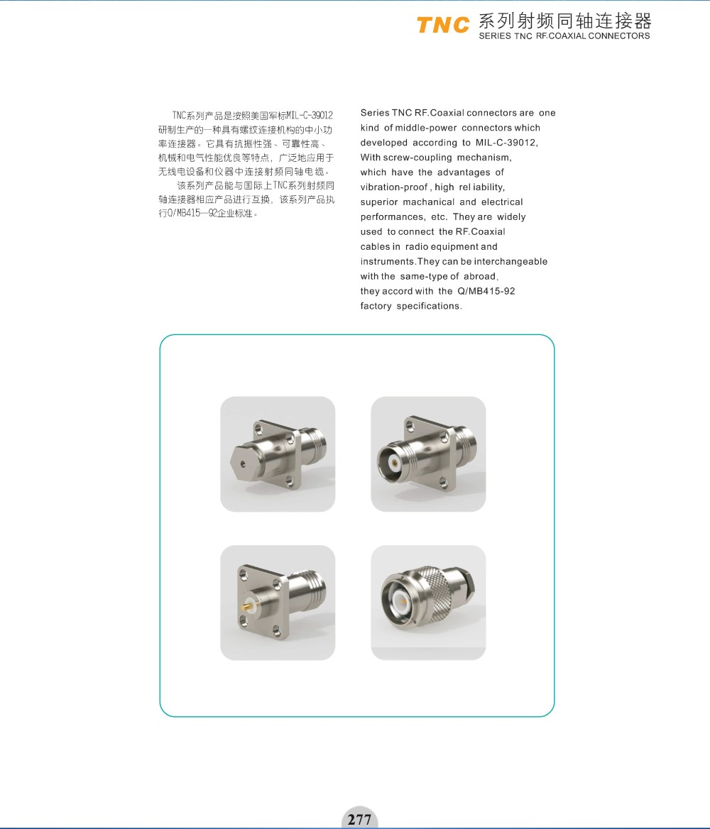 TNC系列产品是按照美国军标MIL-C-39012研制生产的一种具有螺纹连接机构的中小功率连接器。它具有抗振性强、可靠性高机械和电气性能优良等特点,广泛地应用于无线电设备和仪器中连接射频同轴电缆该系列产品能与国际上TNC系列射频同轴连接器相应产品进行互换,该系列产品执行Q/MB415-92企业标准。