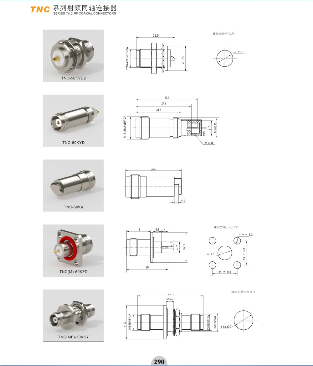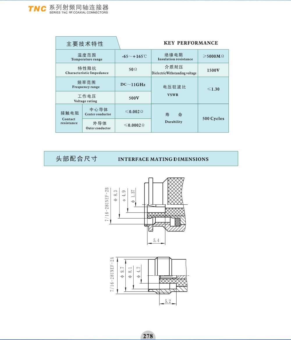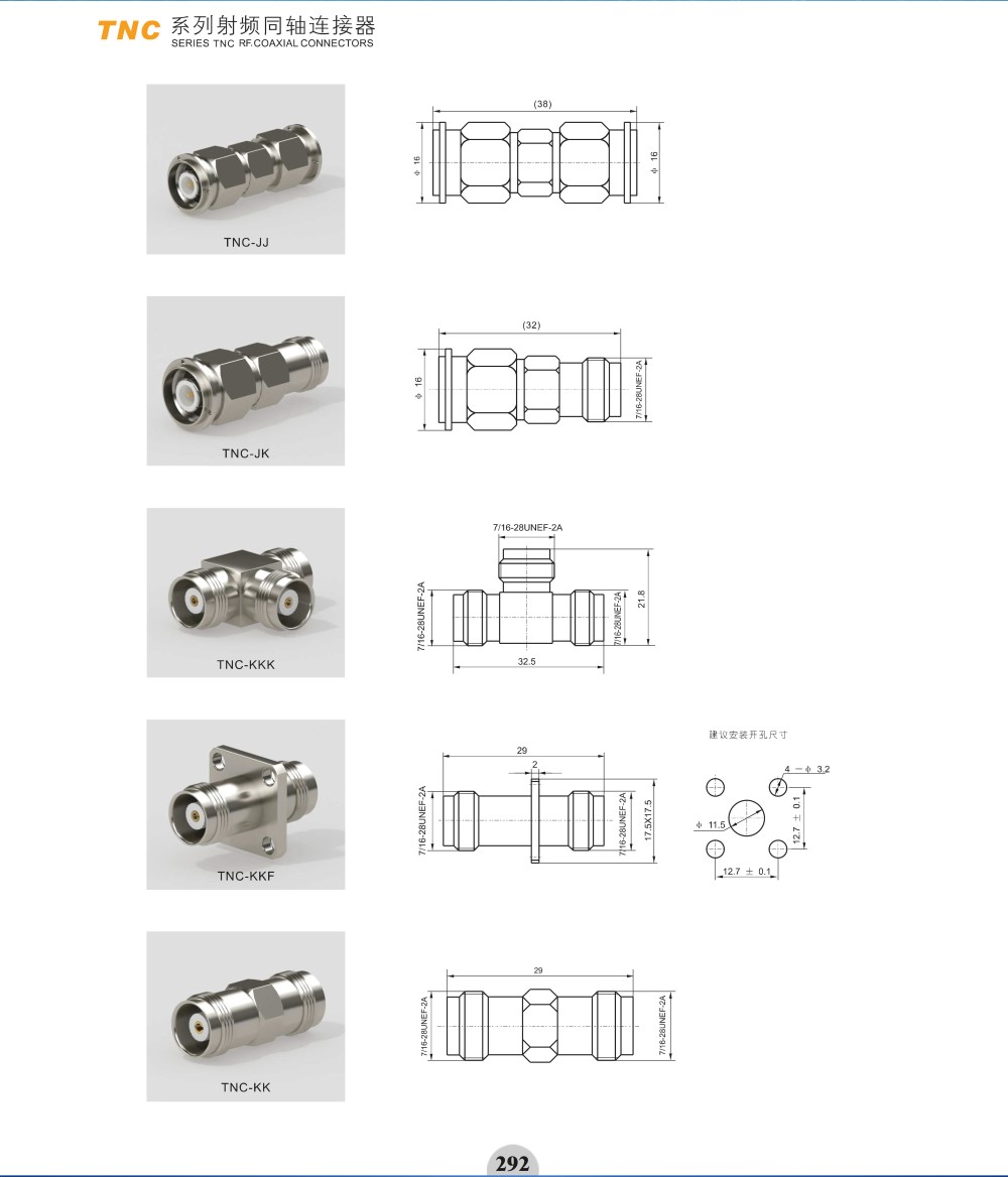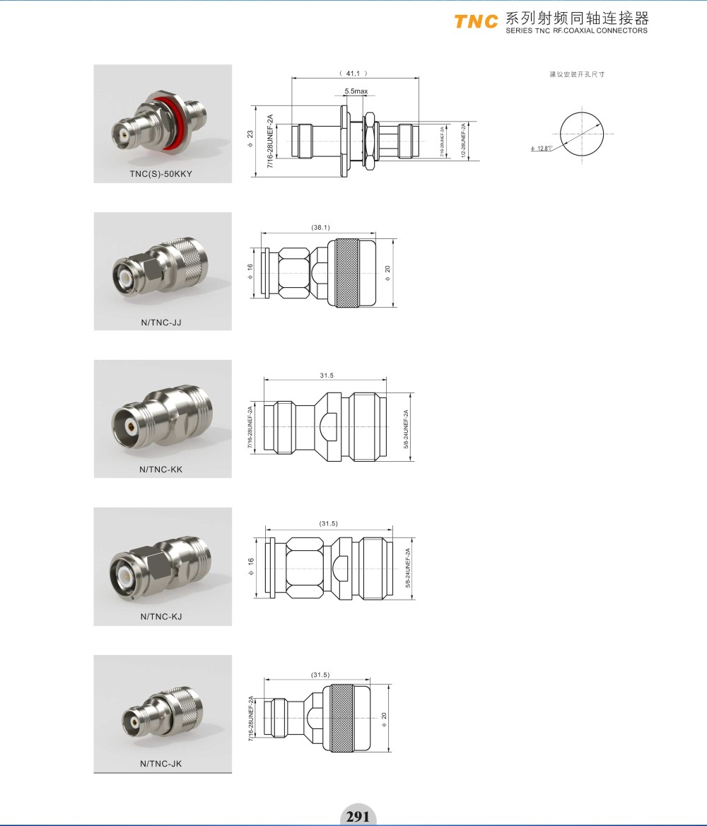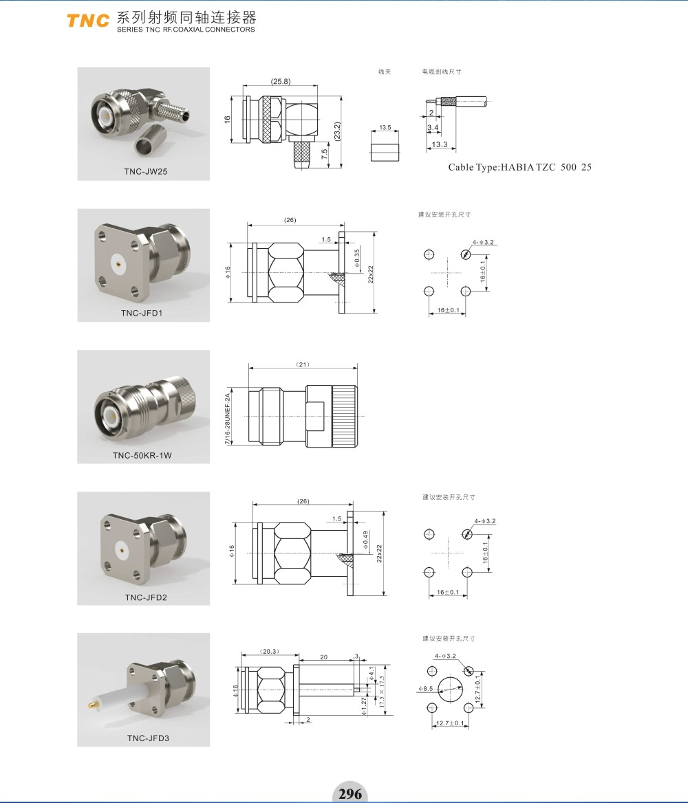TNC系列产品是按照美国军标MIL-C-39012研制生产的一种具有螺纹连接机构的中小功率连接器。它具有抗振性强、可靠性高机械和电气性能优良等特点,广泛地应用于无线电设备和仪器中连接射频同轴电缆该系列产品能与国际上TNC系列射频同轴连接器相应产品进行互换,该系列产品执行Q/MB415-92企业标准。
