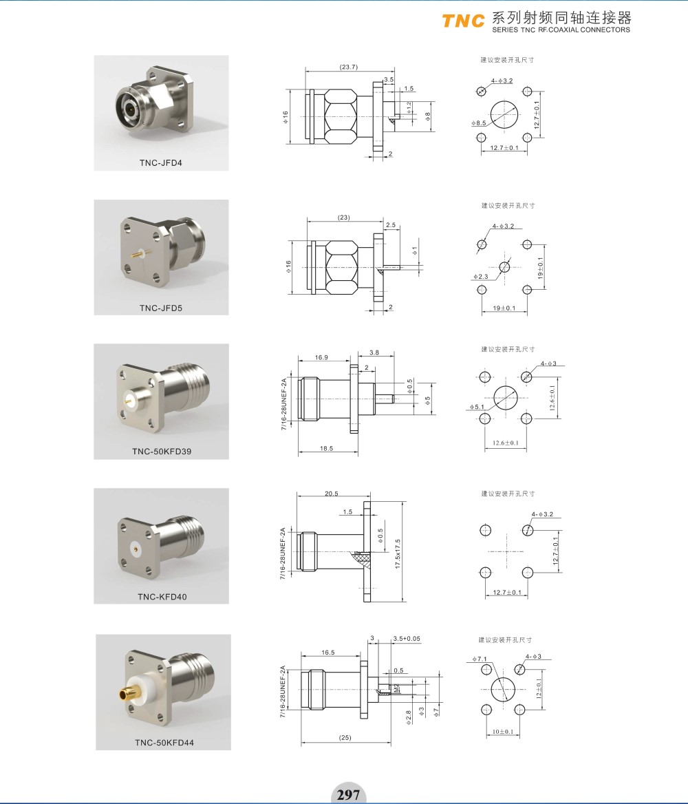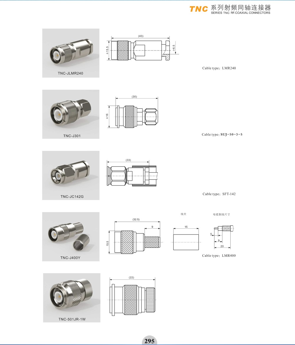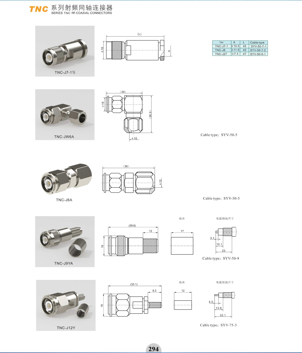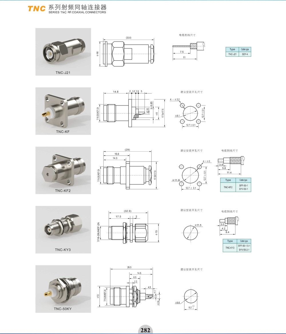 TNC系列产品是按照美国军标MIL-C-39012研制生产的一种具有螺纹连接机构的中小功率连接器。它具有抗振性强、可靠性高机械和电气性能优良等特点,广泛地应用于无线电设备和仪器中连接射频同轴电缆该系列产品能与国际上TNC系列射频同轴连接器相应产品进行互换,该系列产品执行Q/MB415-92企业标准。