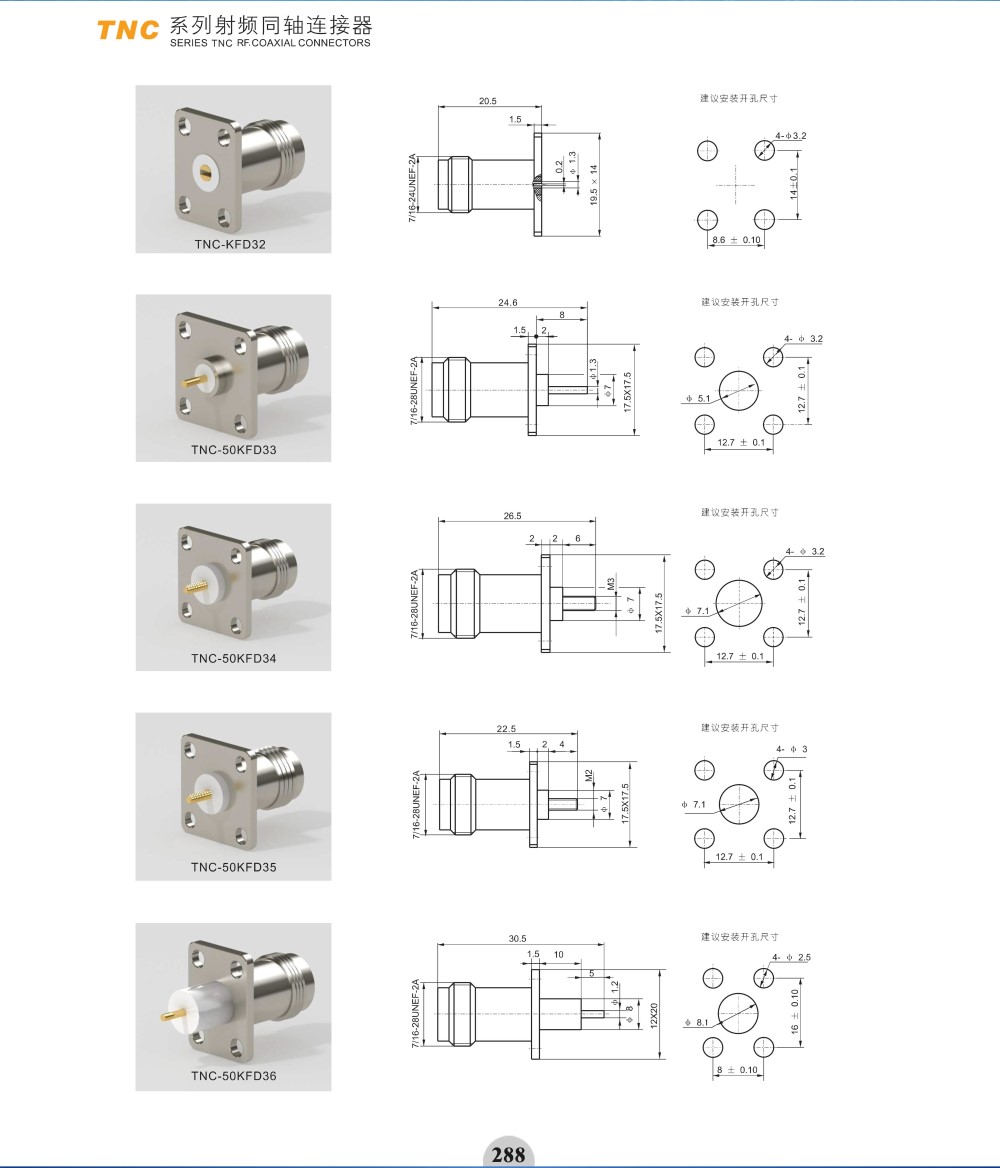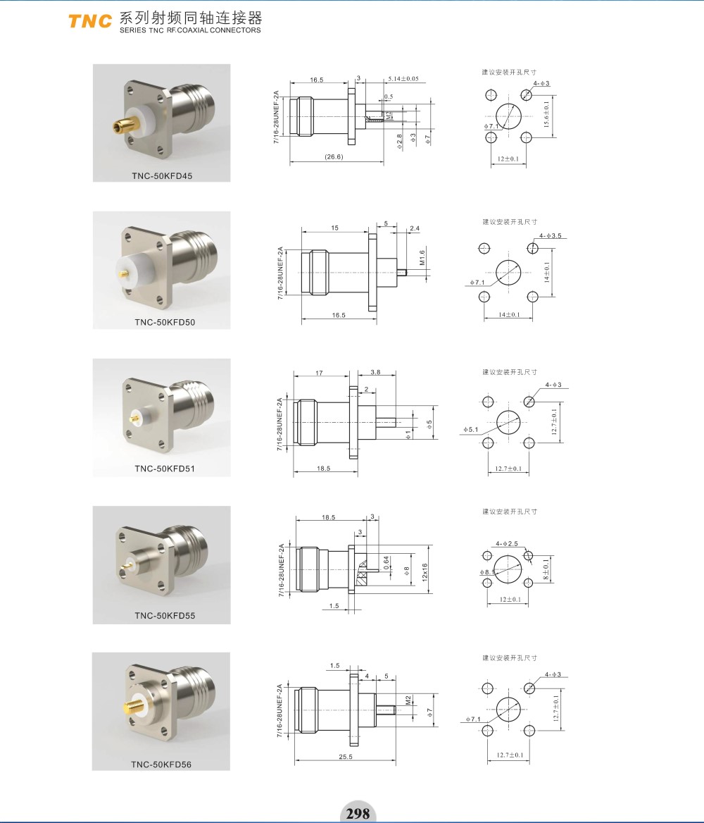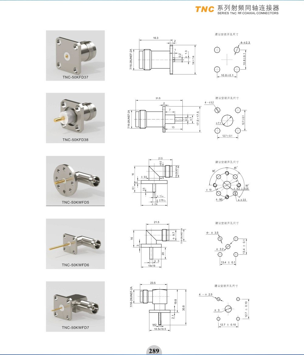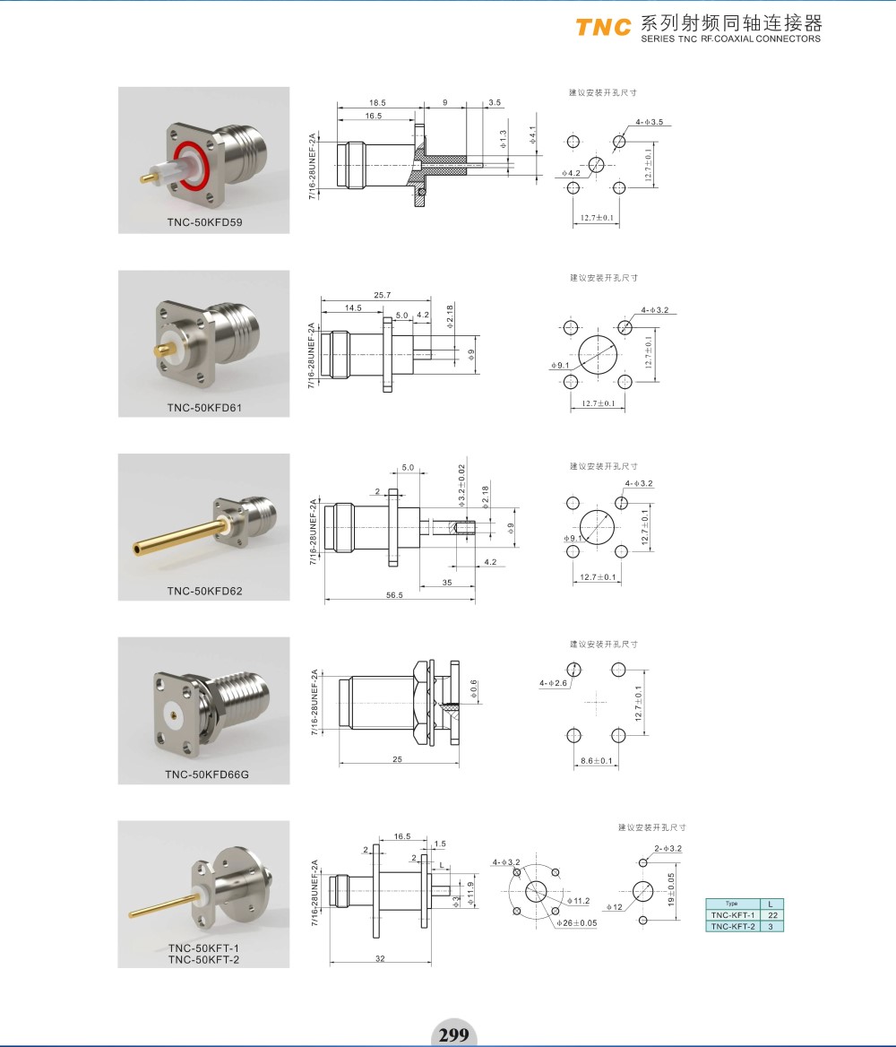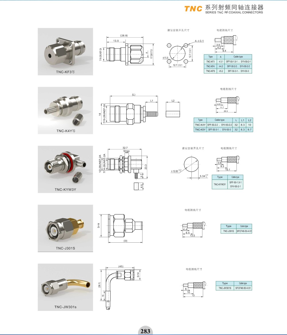 TNC系列产品是按照美国军标MIL-C-39012研制生产的一种具有螺纹连接机构的中小功率连接器。它具有抗振性强、可靠性高机械和电气性能优良等特点,广泛地应用于无线电设备和仪器中连接射频同轴电缆该系列产品能与国际上TNC系列射频同轴连接器相应产品进行互换,该系列产品执行Q/MB415-92企业标准。