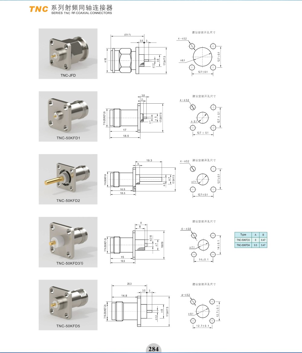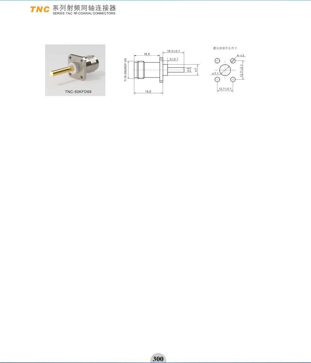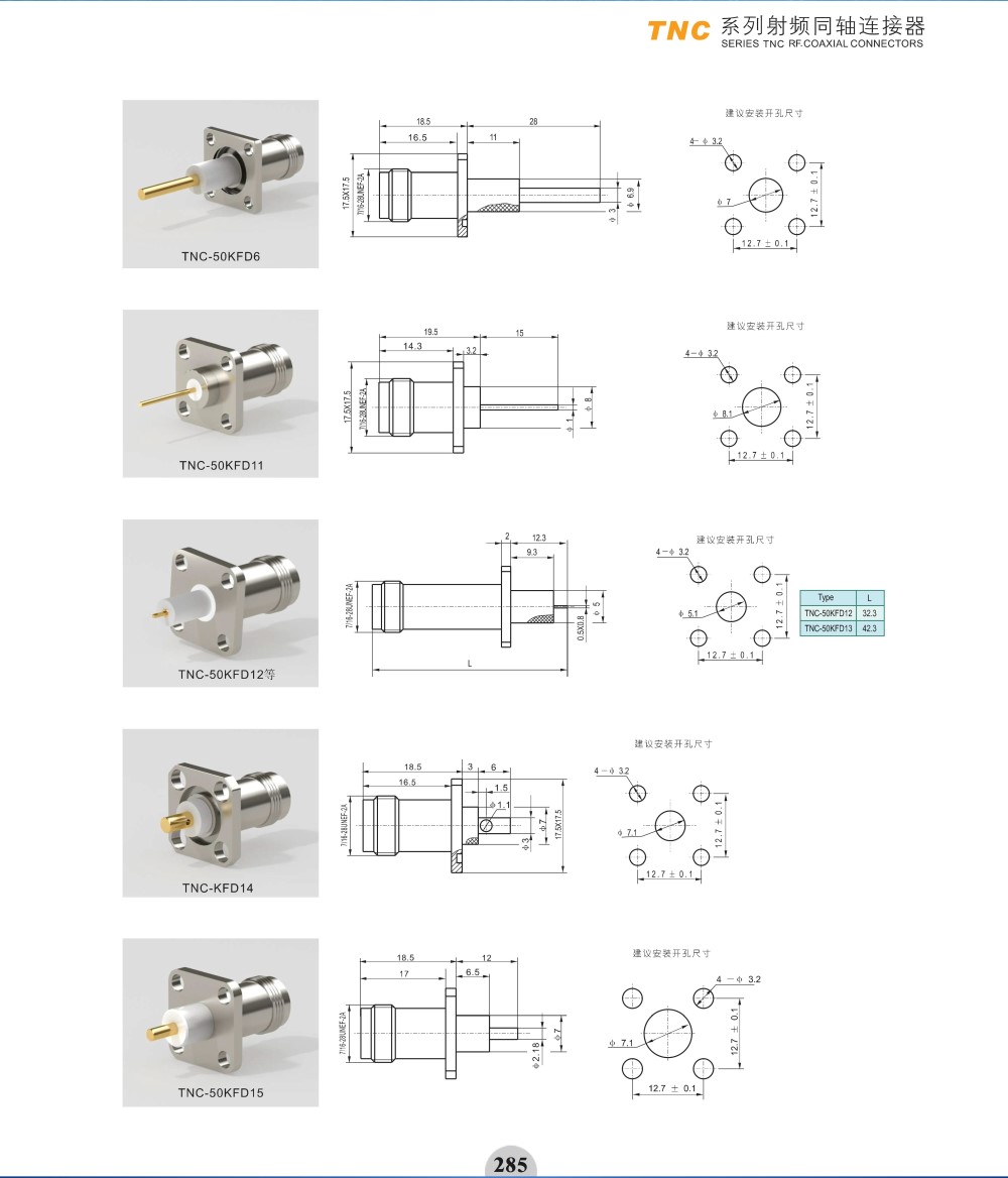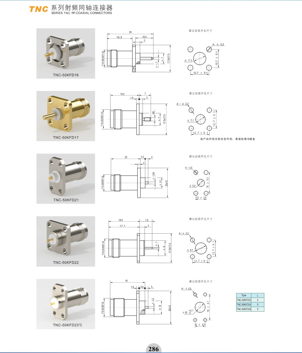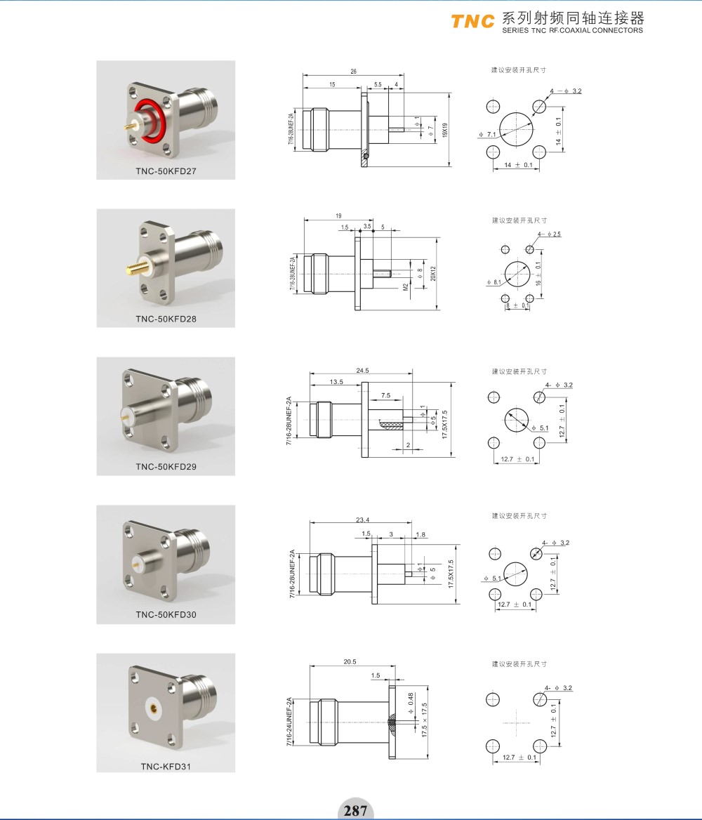 TNC系列产品是按照美国军标MIL-C-39012研制生产的一种具有螺纹连接机构的中小功率连接器。它具有抗振性强、可靠性高机械和电气性能优良等特点,广泛地应用于无线电设备和仪器中连接射频同轴电缆该系列产品能与国际上TNC系列射频同轴连接器相应产品进行互换,该系列产品执行Q/MB415-92企业标准。