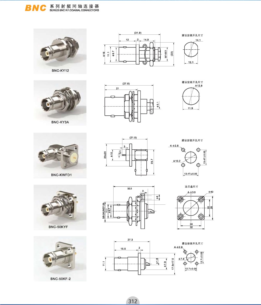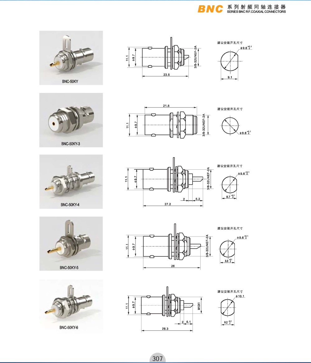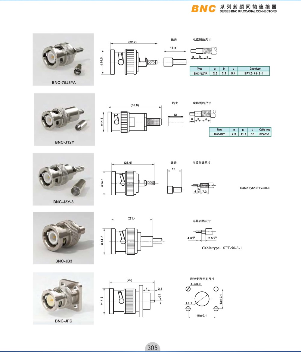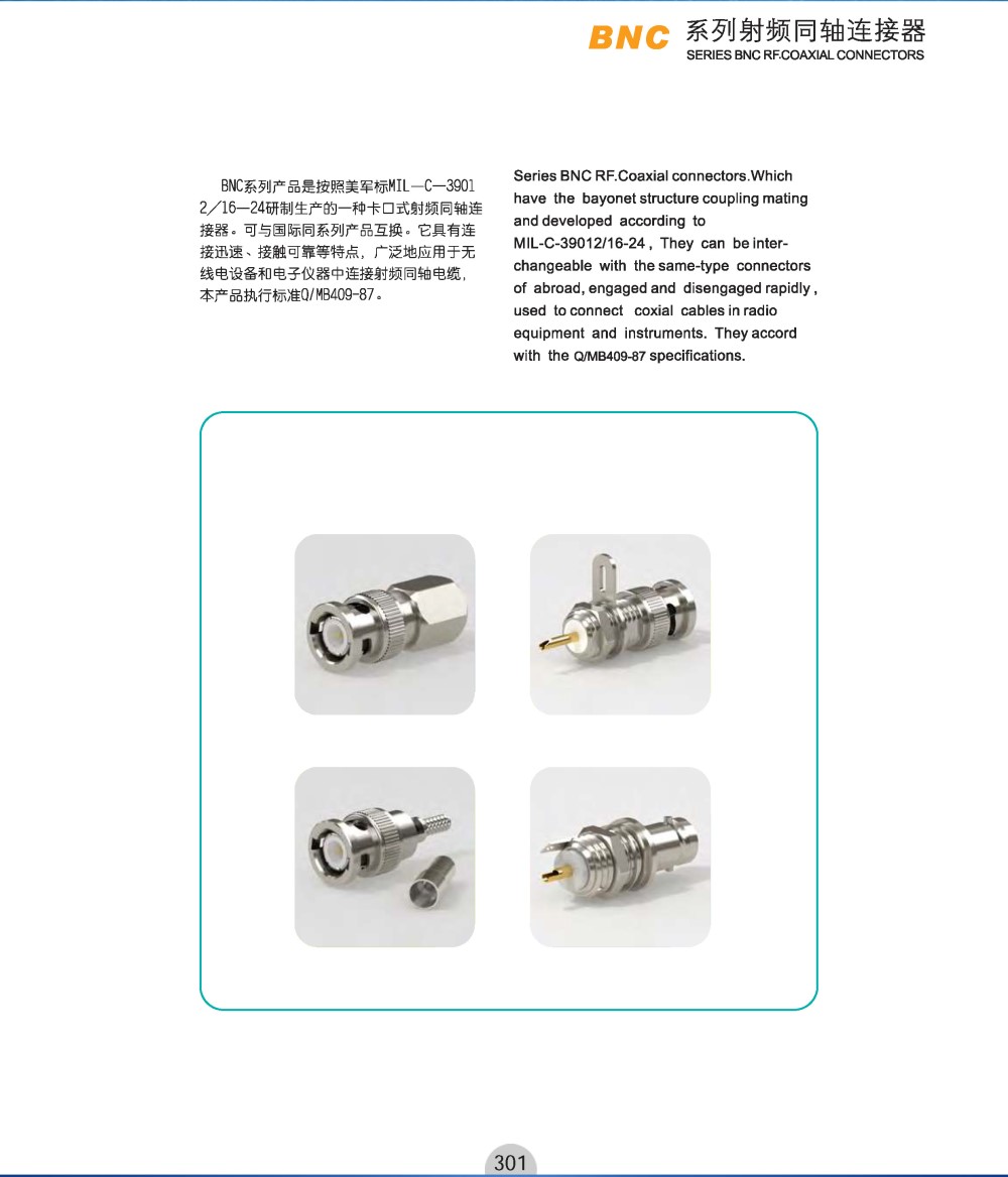 BNC系列产品是按照美军标MIL-C-39012/16一24研制生产的一种卡口式射频同轴连接器。可与国际同系列产品互换。它具有连接迅速、接触可靠等特点,广泛地应用于无线电设备和电子仪器中连接射频同轴电缆本产品执行标准Q/MB409-87。