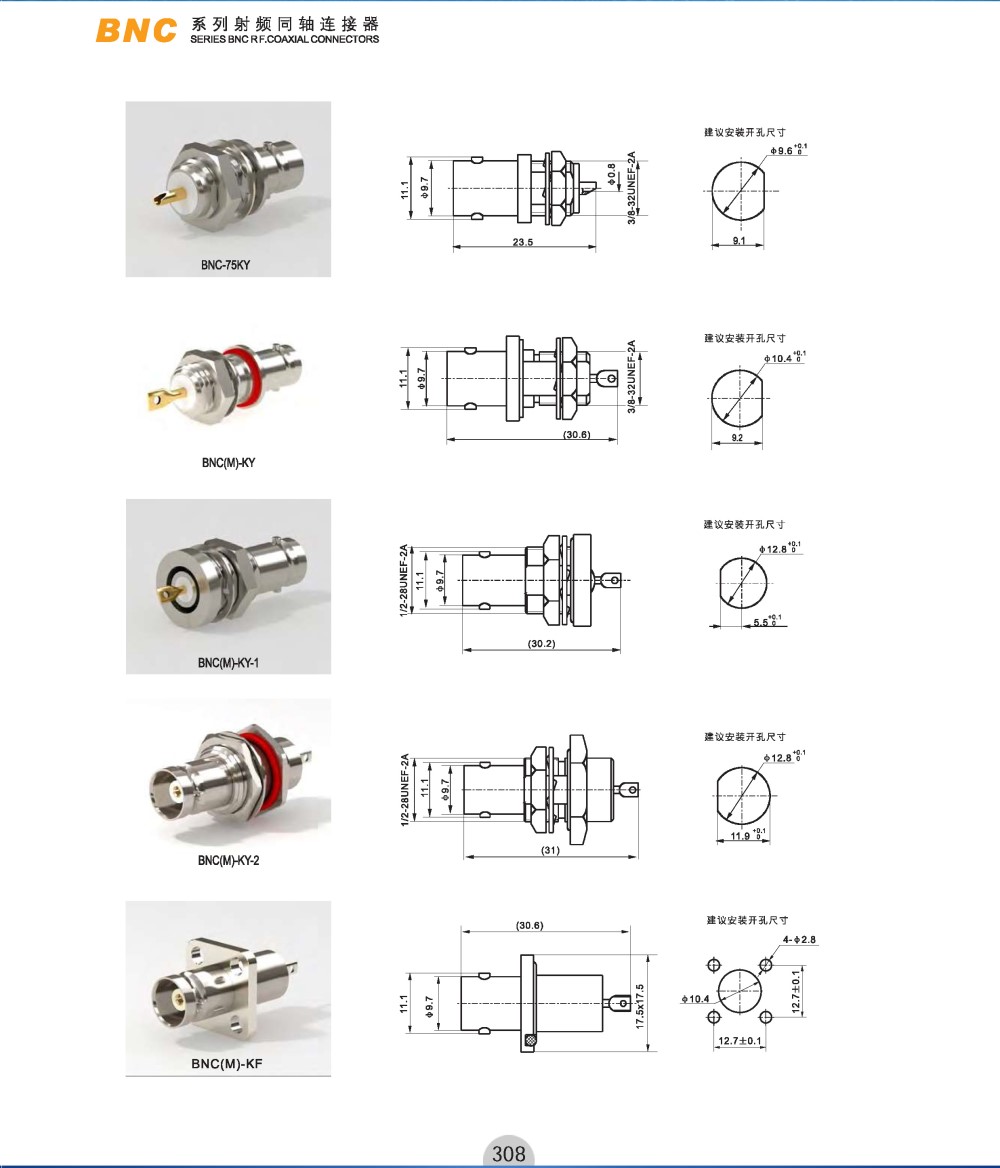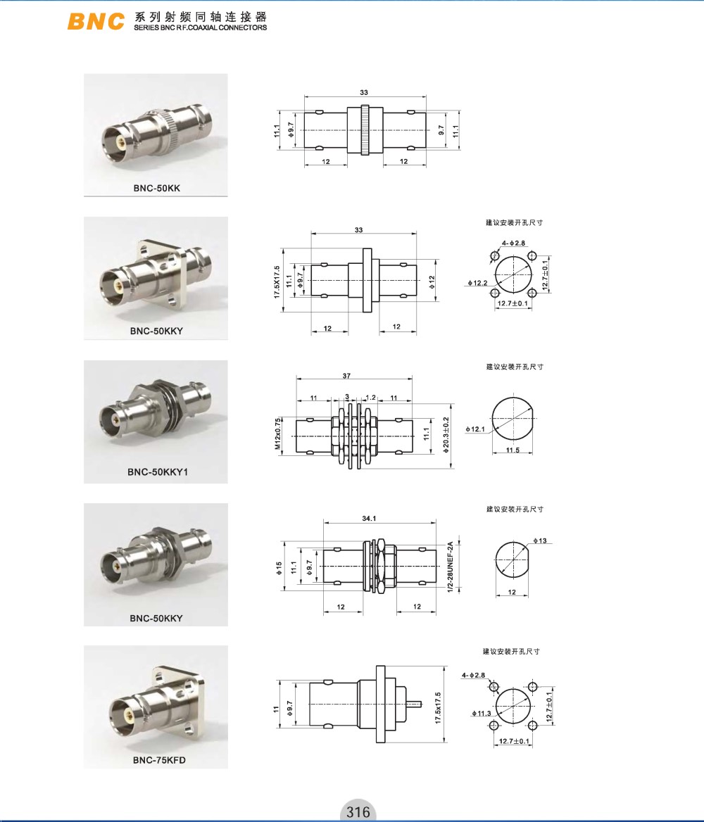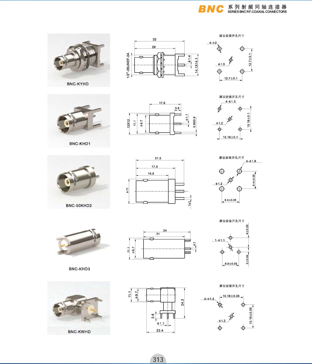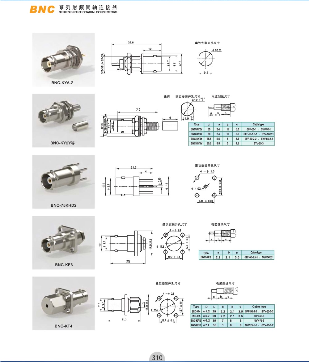 BNC系列产品是按照美军标MIL-C-39012/16一24研制生产的一种卡口式射频同轴连接器。可与国际同系列产品互换。它具有连接迅速、接触可靠等特点,广泛地应用于无线电设备和电子仪器中连接射频同轴电缆本产品执行标准Q/MB409-87。