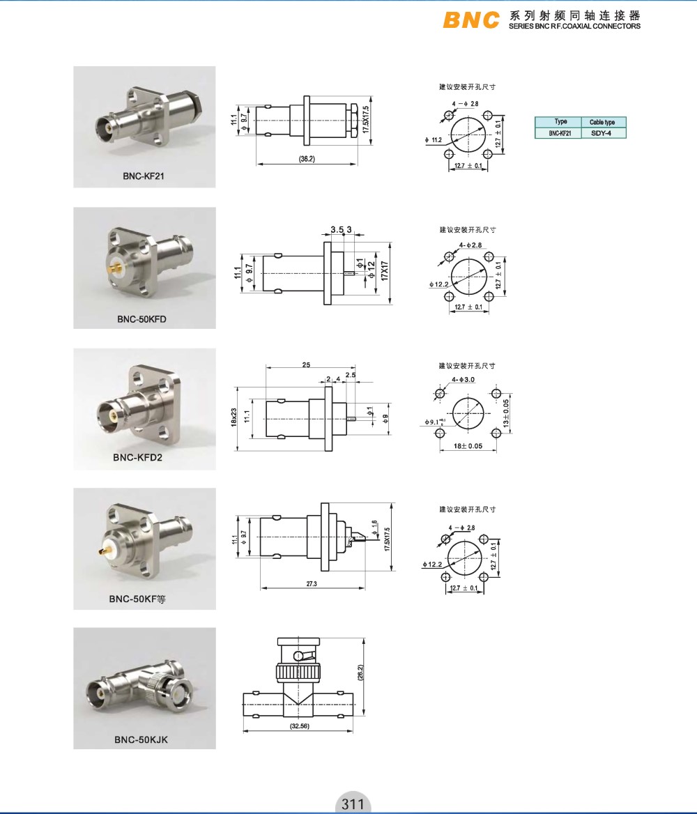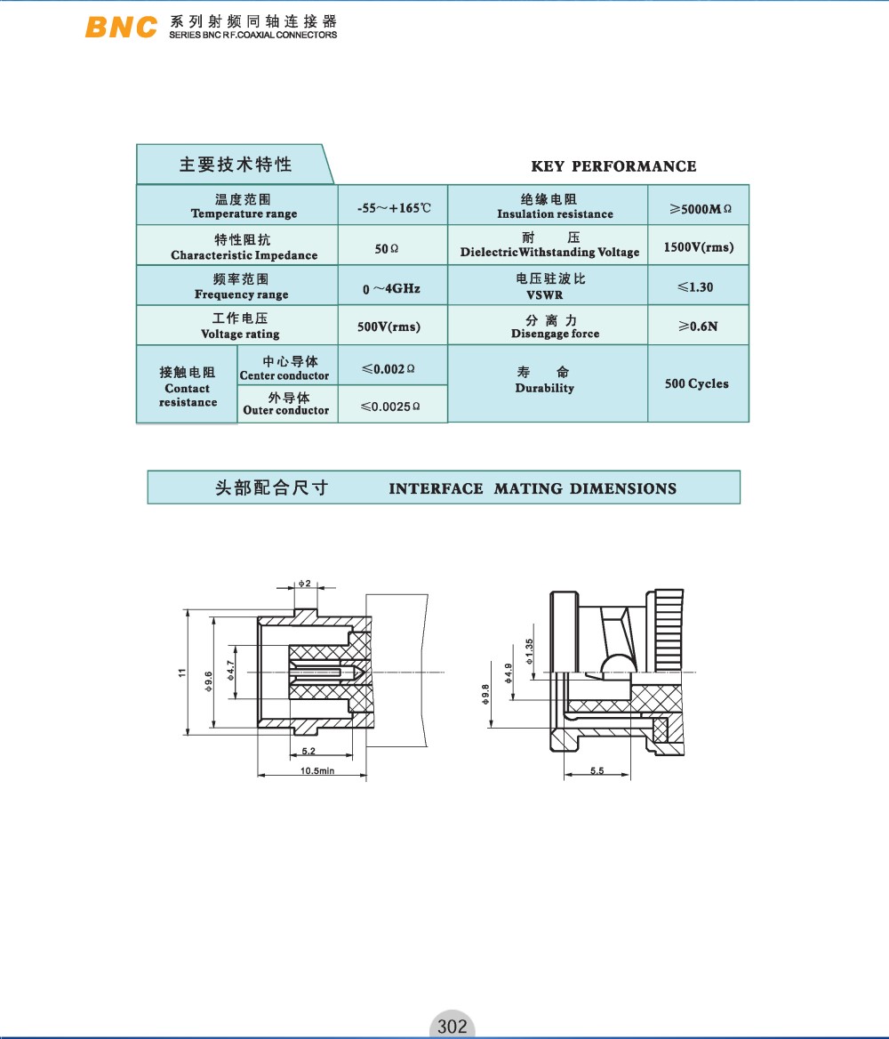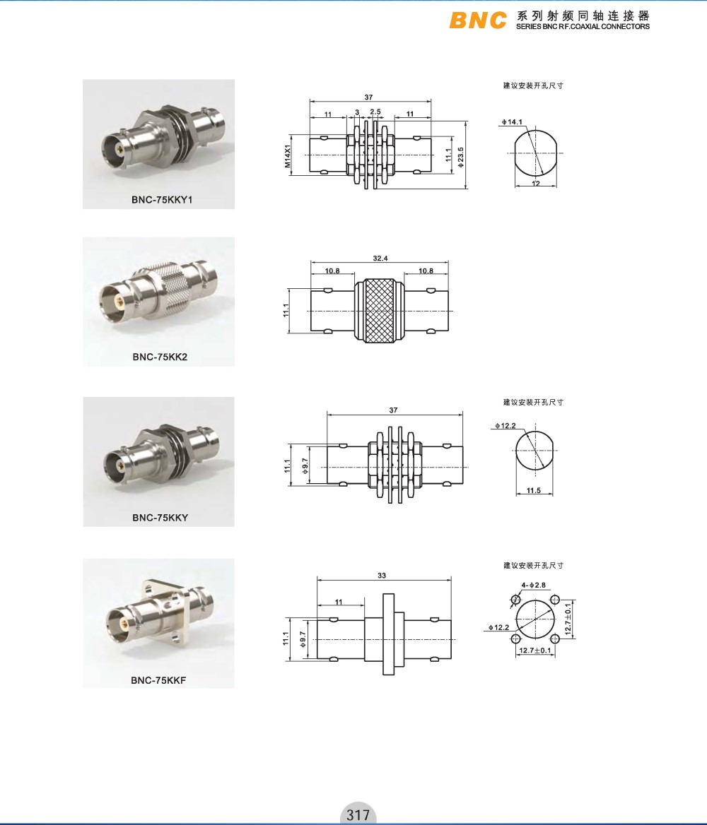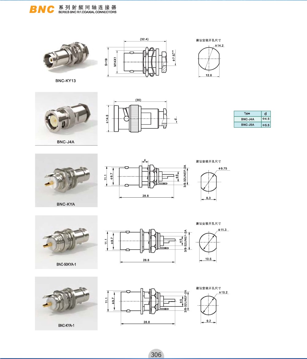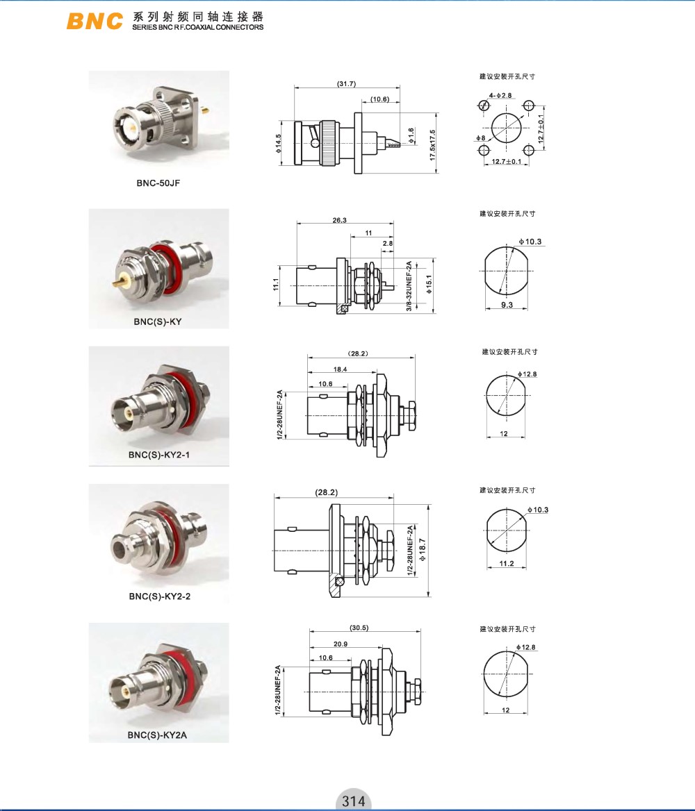 BNC系列产品是按照美军标MIL-C-39012/16一24研制生产的一种卡口式射频同轴连接器。可与国际同系列产品互换。它具有连接迅速、接触可靠等特点,广泛地应用于无线电设备和电子仪器中连接射频同轴电缆本产品执行标准Q/MB409-87。