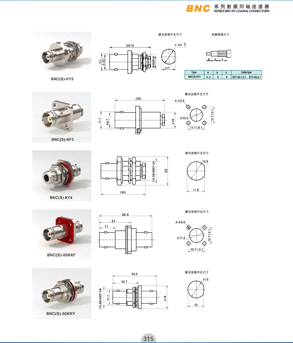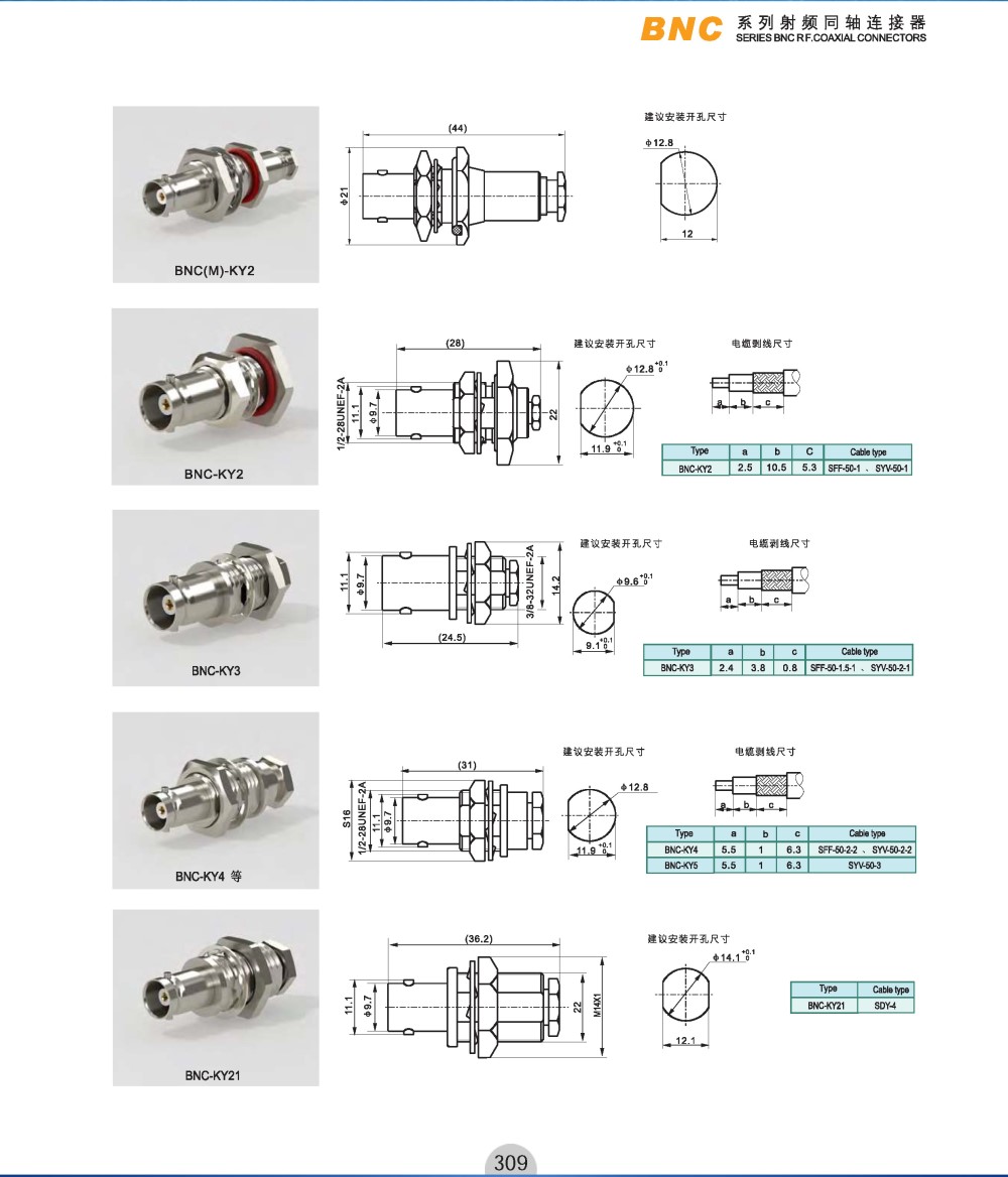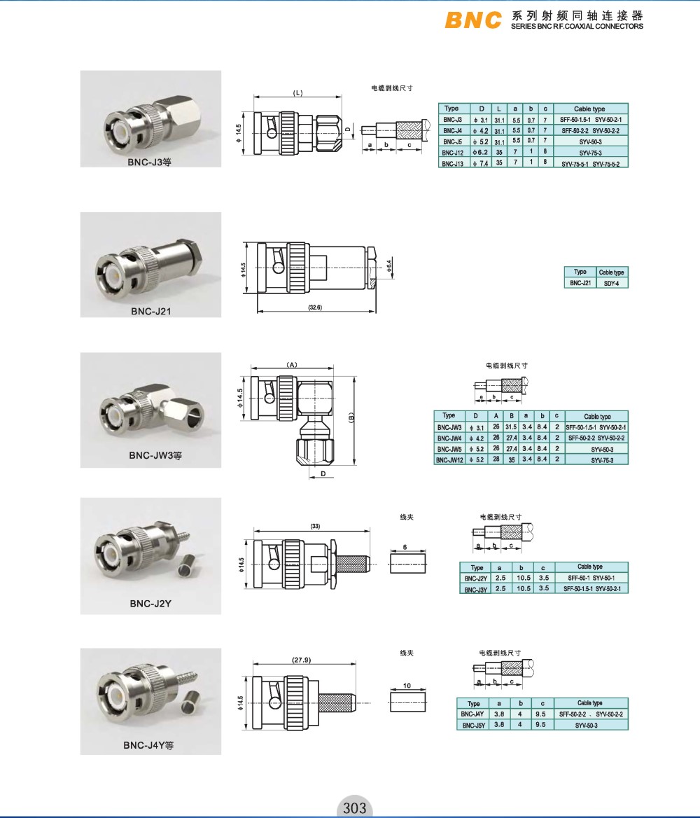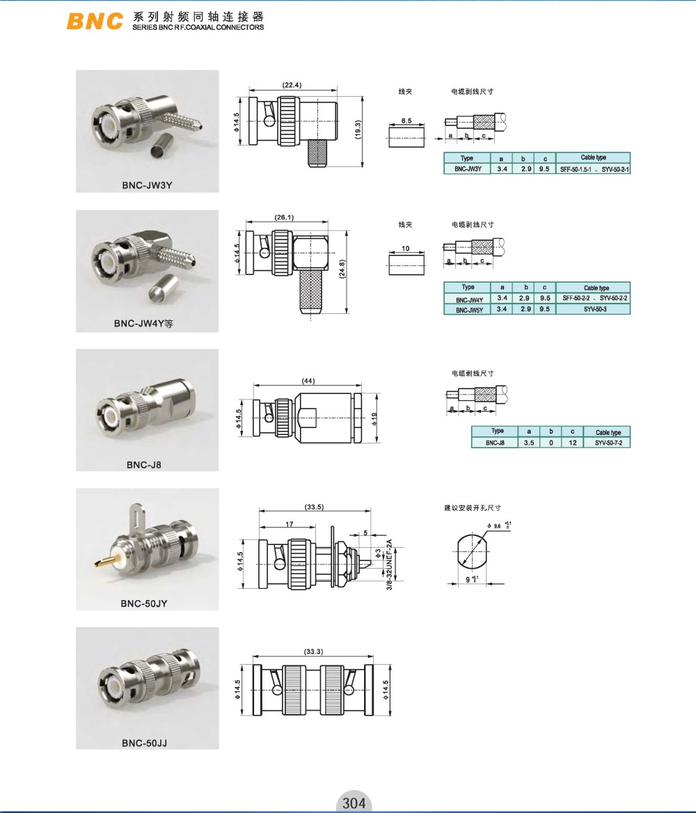 BNC系列产品是按照美军标MIL-C-39012/16一24研制生产的一种卡口式射频同轴连接器。可与国际同系列产品互换。它具有连接迅速、接触可靠等特点,广泛地应用于无线电设备和电子仪器中连接射频同轴电缆本产品执行标准Q/MB409-87。