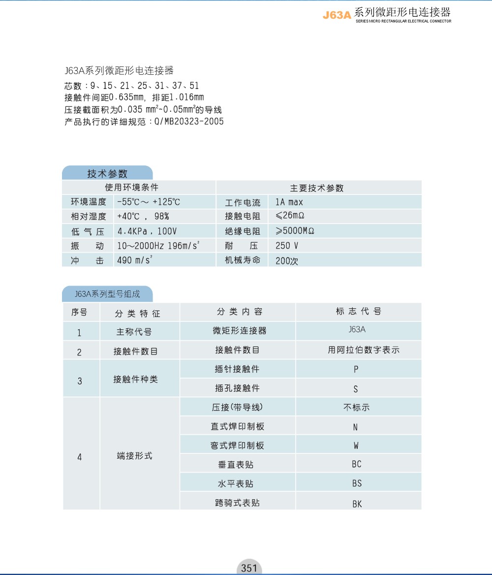 产品描述:]63A系列微距形电连接器芯数:9、15、21、25、31、37、51接触件间距0.635mm,排距1.016mm压接截面积为0.035mm²~0.05mm²的导线产品执行的详细规范:Q/MB20323-2005
